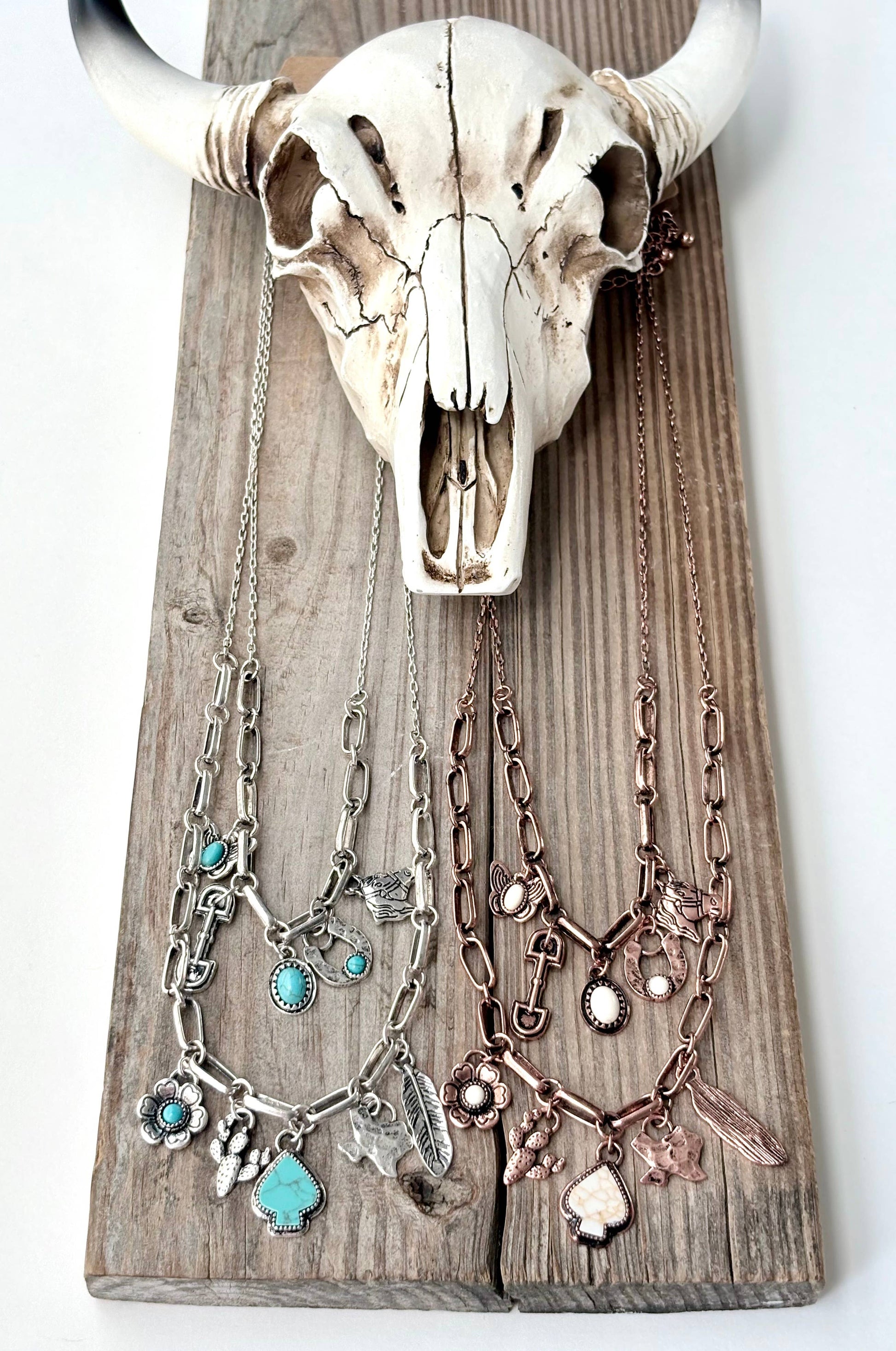 Western Style Turquoise Stone Multi Charm Necklace Set: Silver