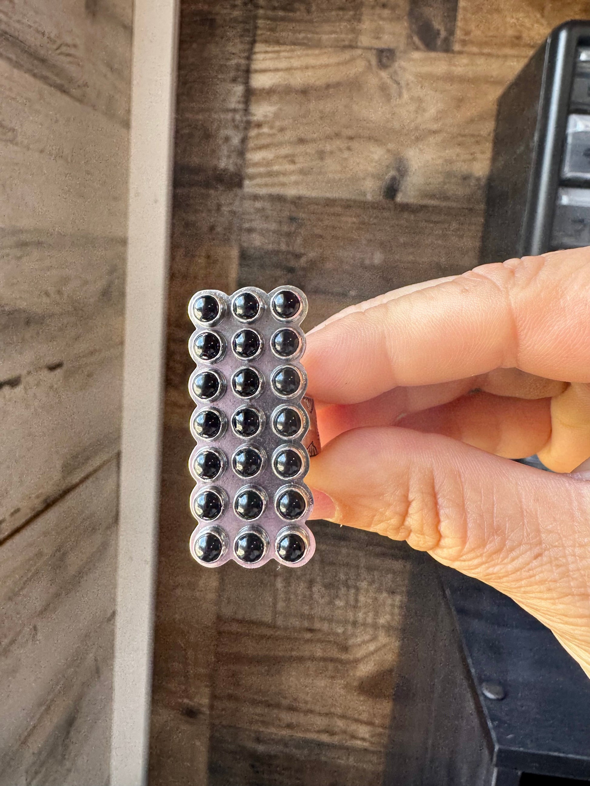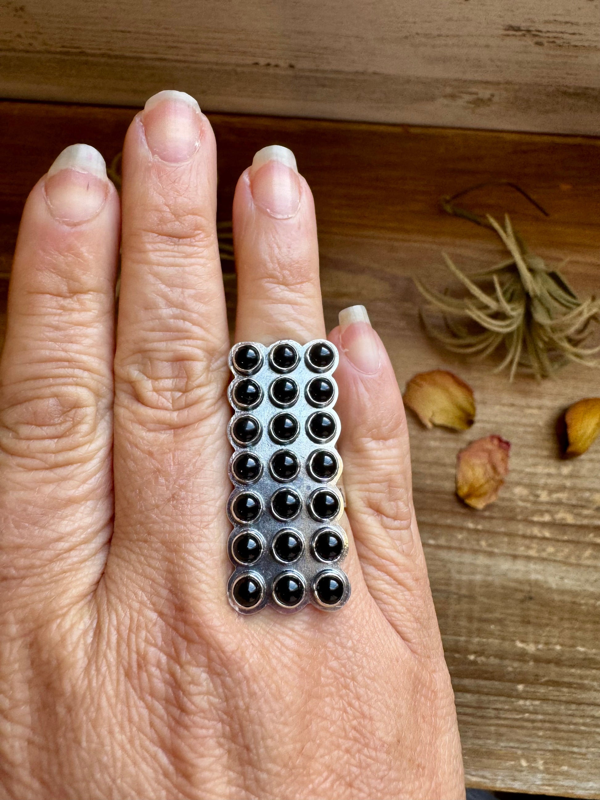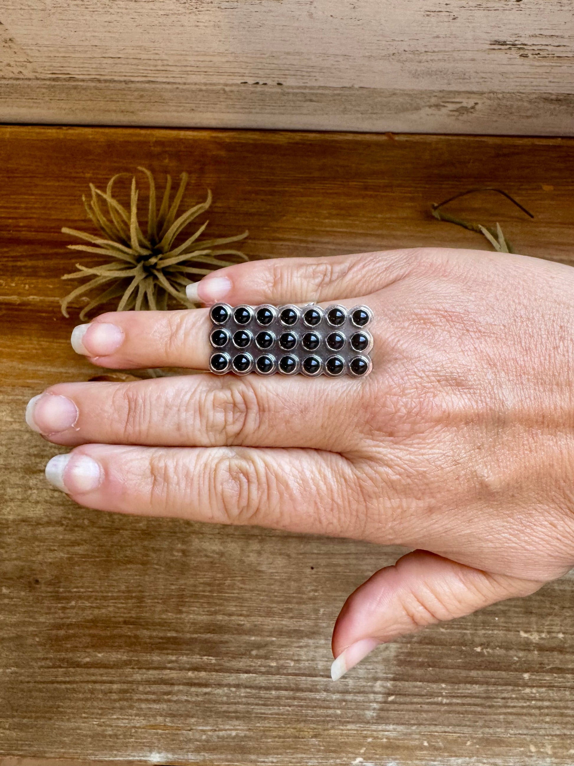 This bold black onyx ring features a sleek rectangular face, handcrafted in sterling silver and made in the USA. Its adjustable band makes it easy to wear on any finger, and the deep black stone adds a modern edge to any look.