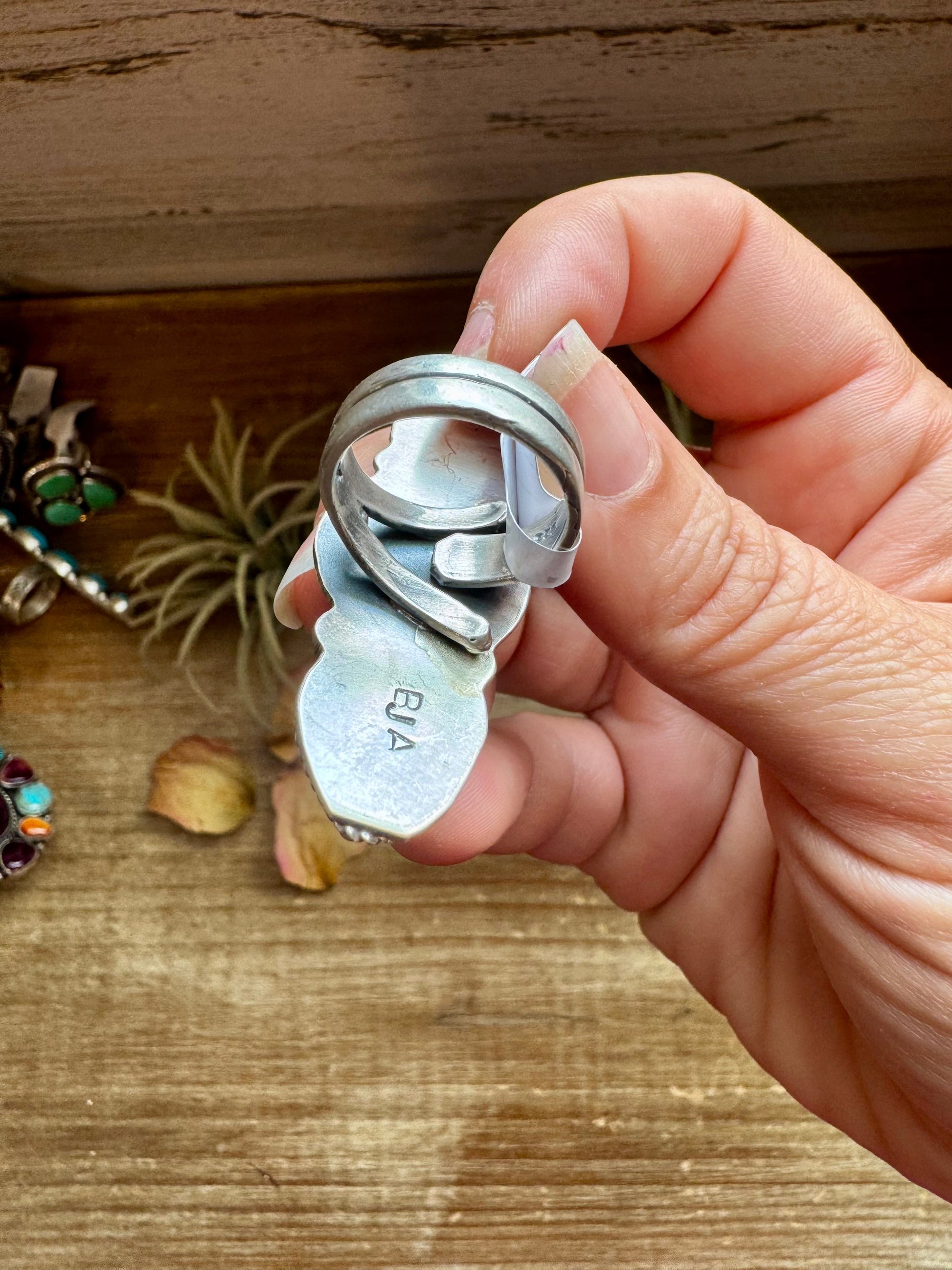 A bold statement piece with serious character. This adjustable concho-style ring features two stunning green turquoise stones set in sterling silver. Handmade by Navajo artist Boyd Ashley (BJA), it’s designed in a long pointer ringsilhouette—perfect for elongating the hand and standing out in any stack.