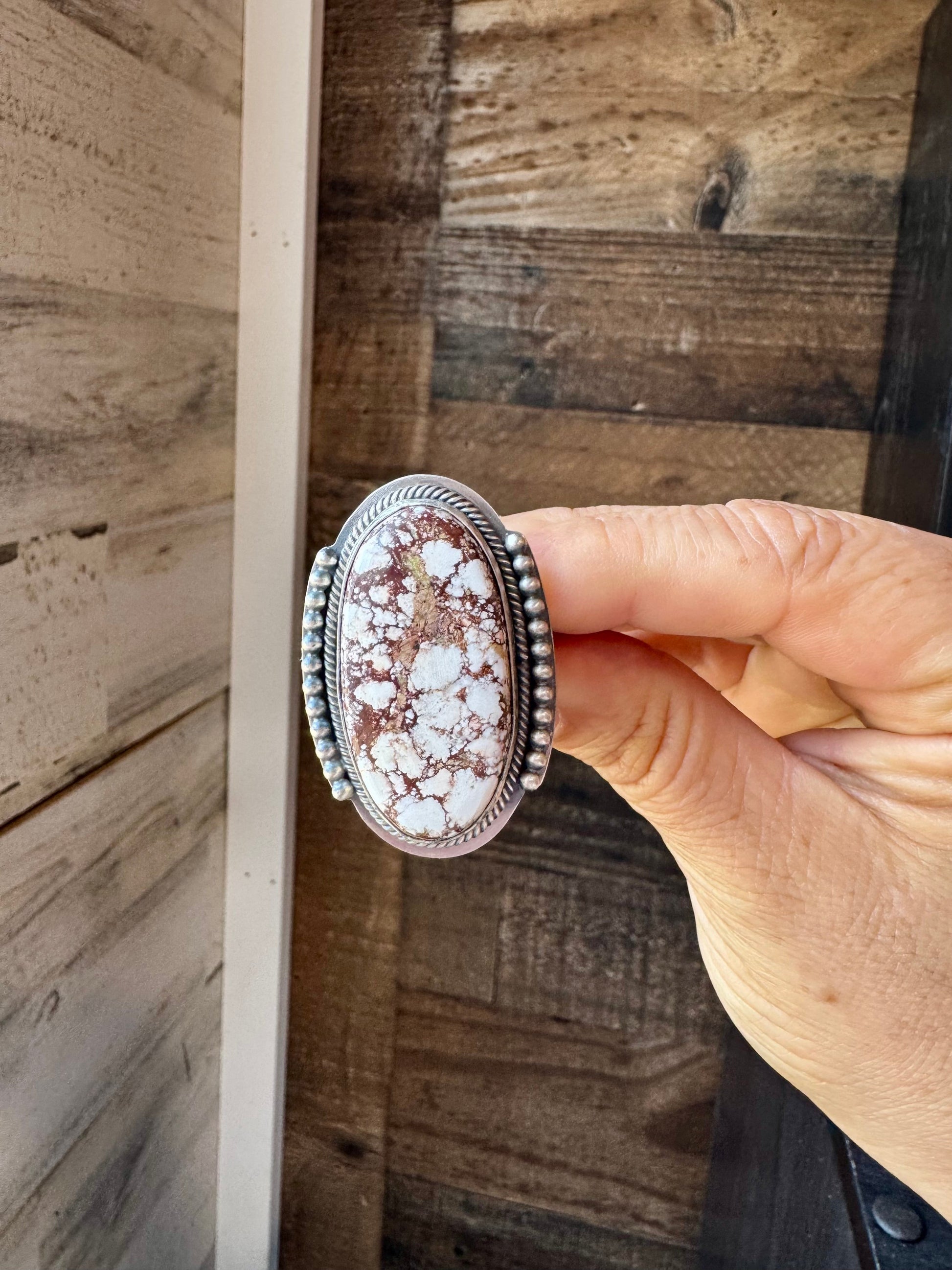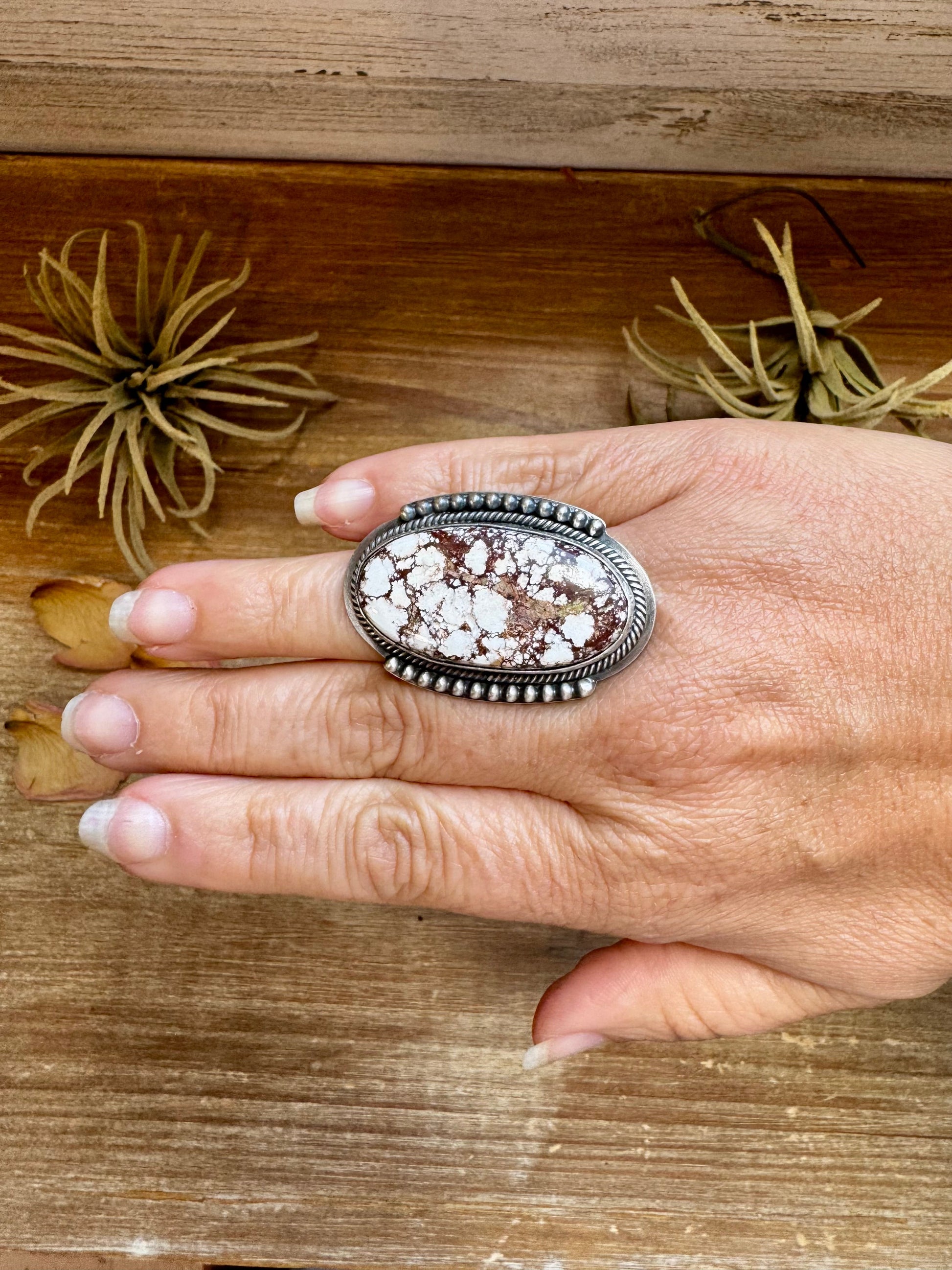 This bold adjustable ring features a large Wild Horse stone set in handcrafted sterling silver by Navajo artist Ned Nez. With its striking natural pattern and substantial size, this piece makes a powerful statement.