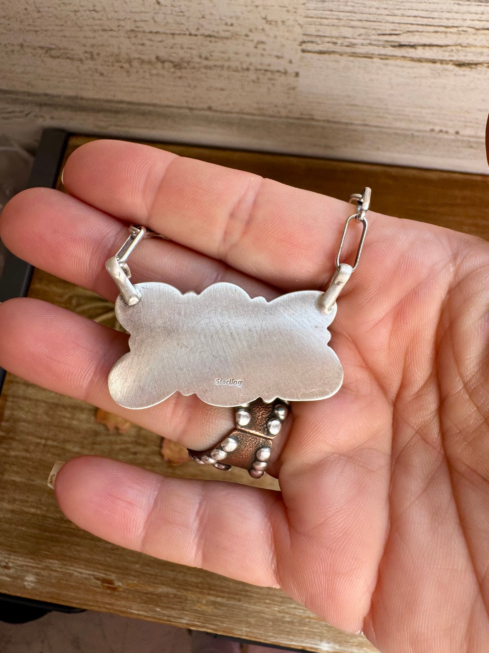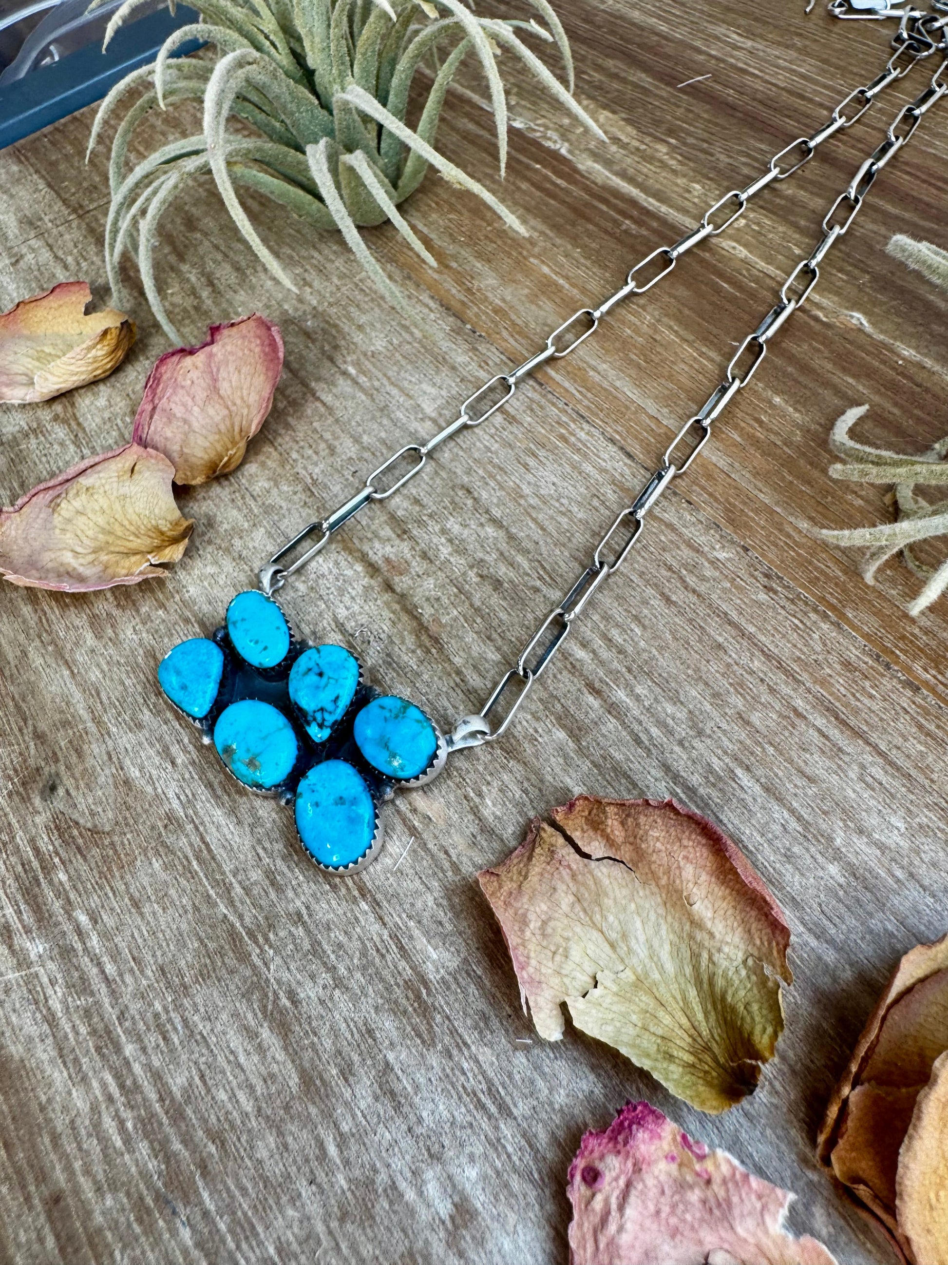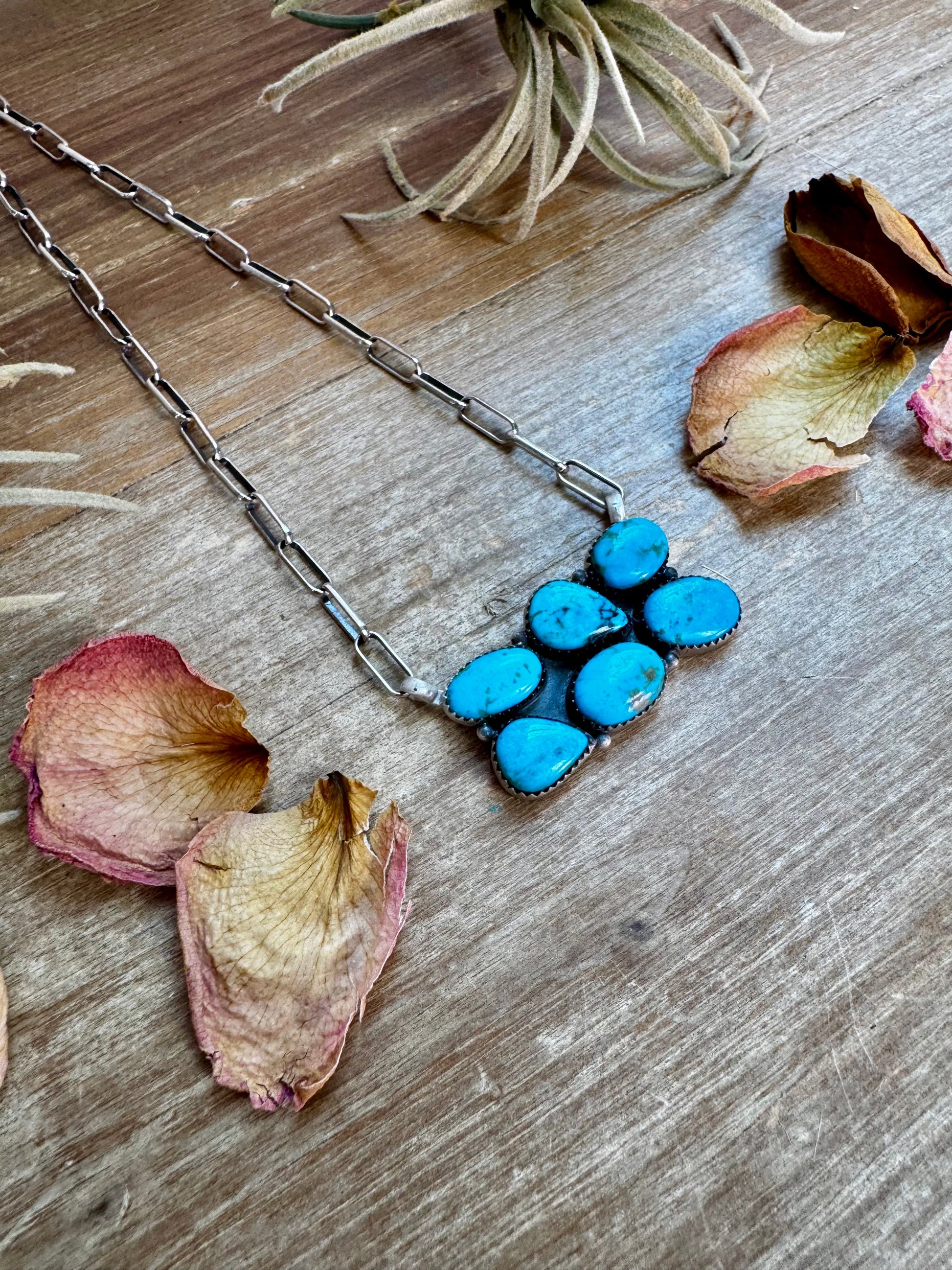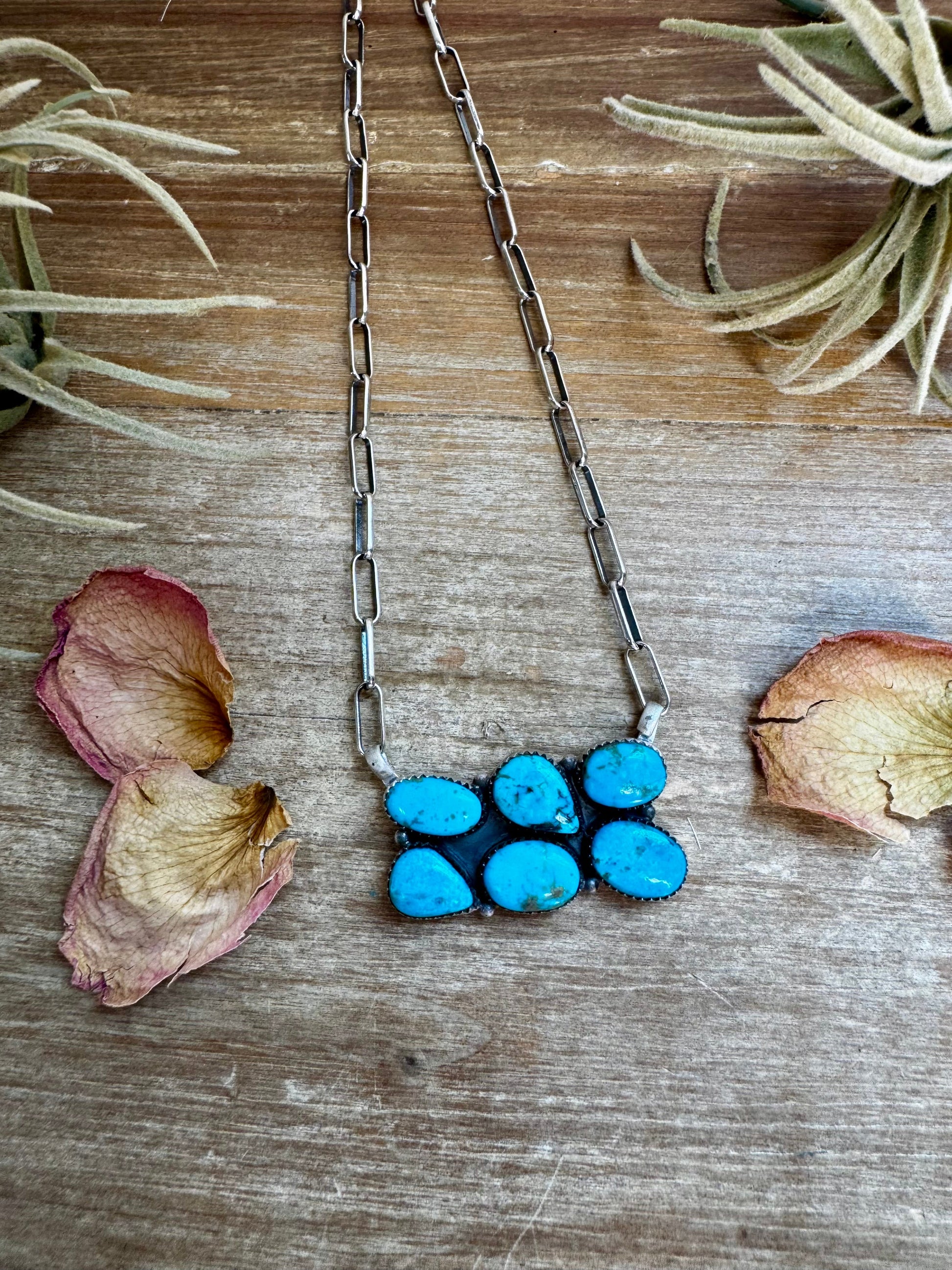 This handcrafted sterling silver bar necklace features six vibrant Kingman turquoise stones on a sleek paperclip chain. The 19-inch length makes it perfect for layering or wearing alone. Finished with a sharp shepherd’s hook for easy wear.