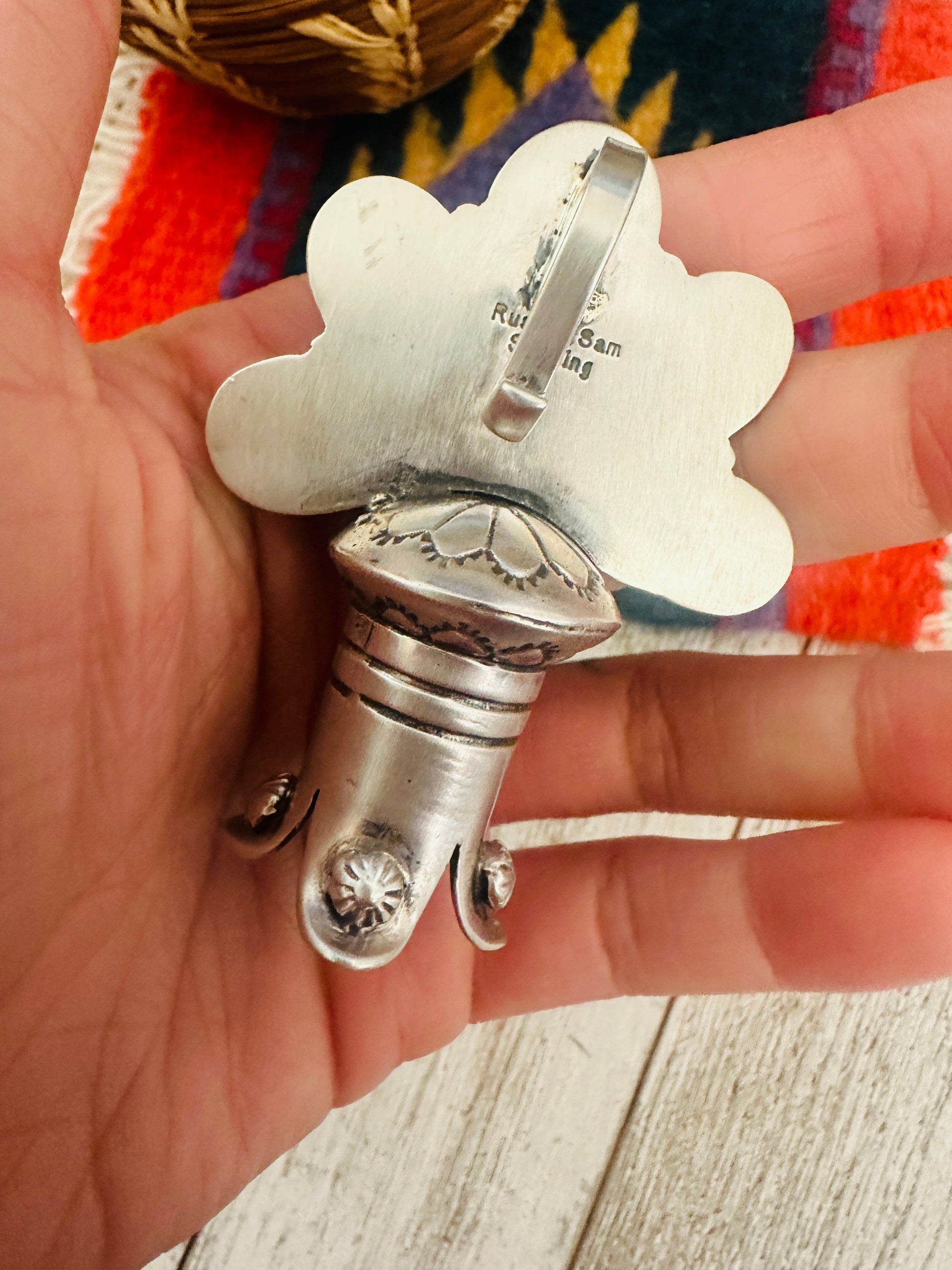 Gorgeous Navajo Sterling Silver and Palomino Turquoise Blossom Pendant. Such beautiful craftsmanship on this piece! Pendant measures 2 1/2 inches long and 2 inches wide. Bale measures 3/8 of an inch across. Stamped Sterling and signed by the artist Russell Sam.
