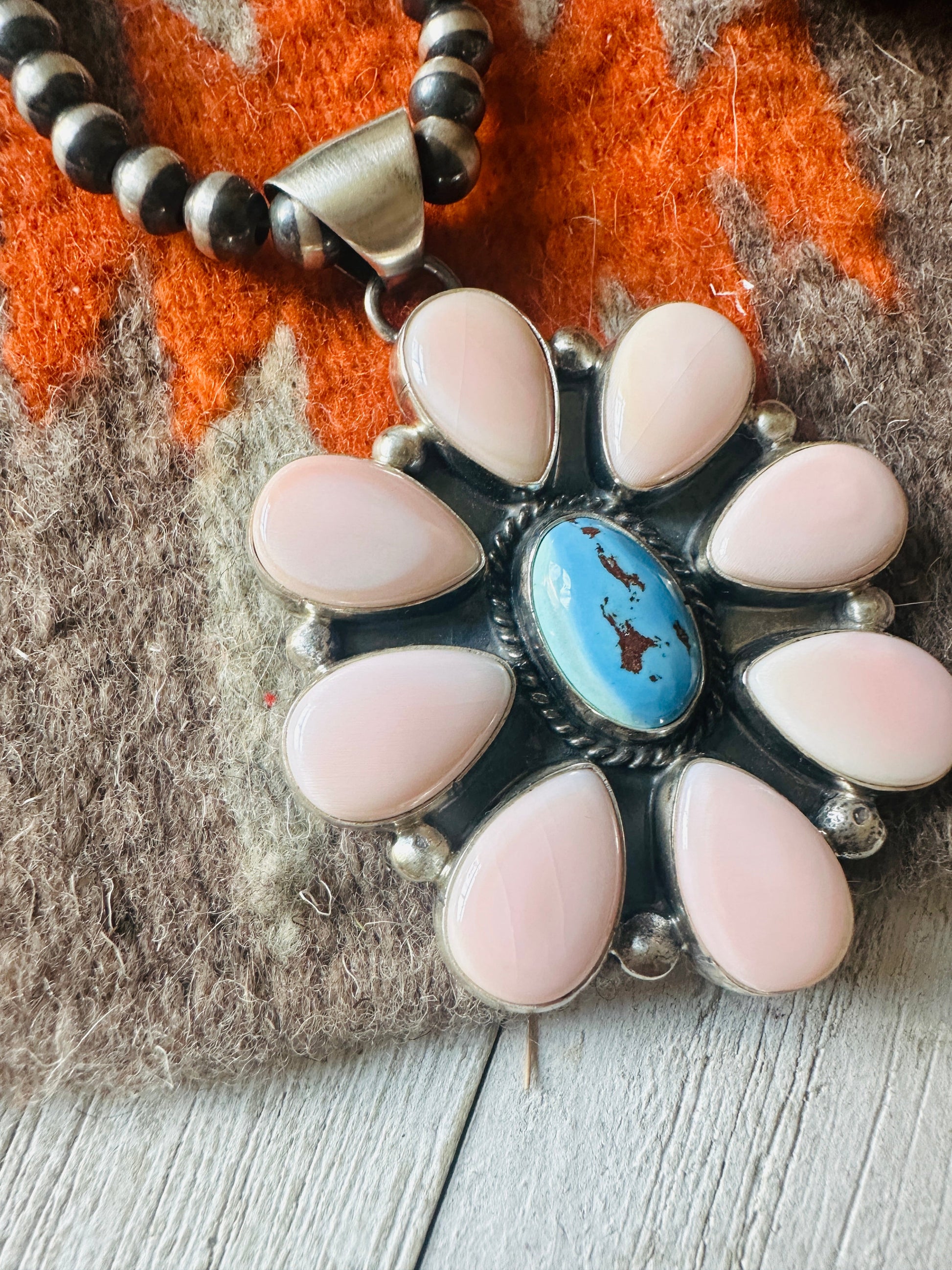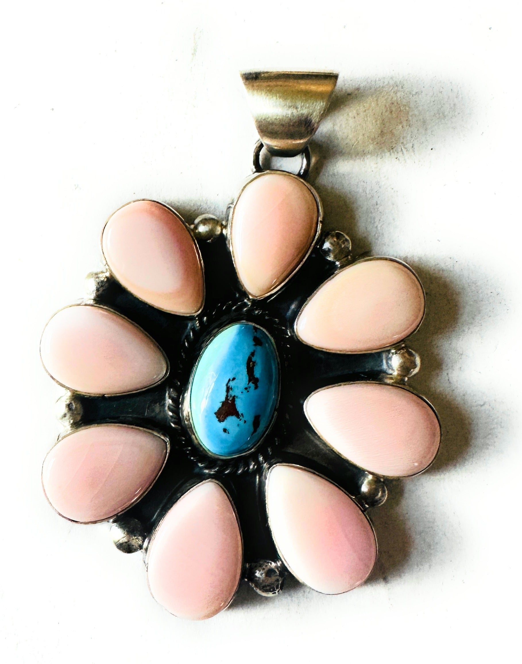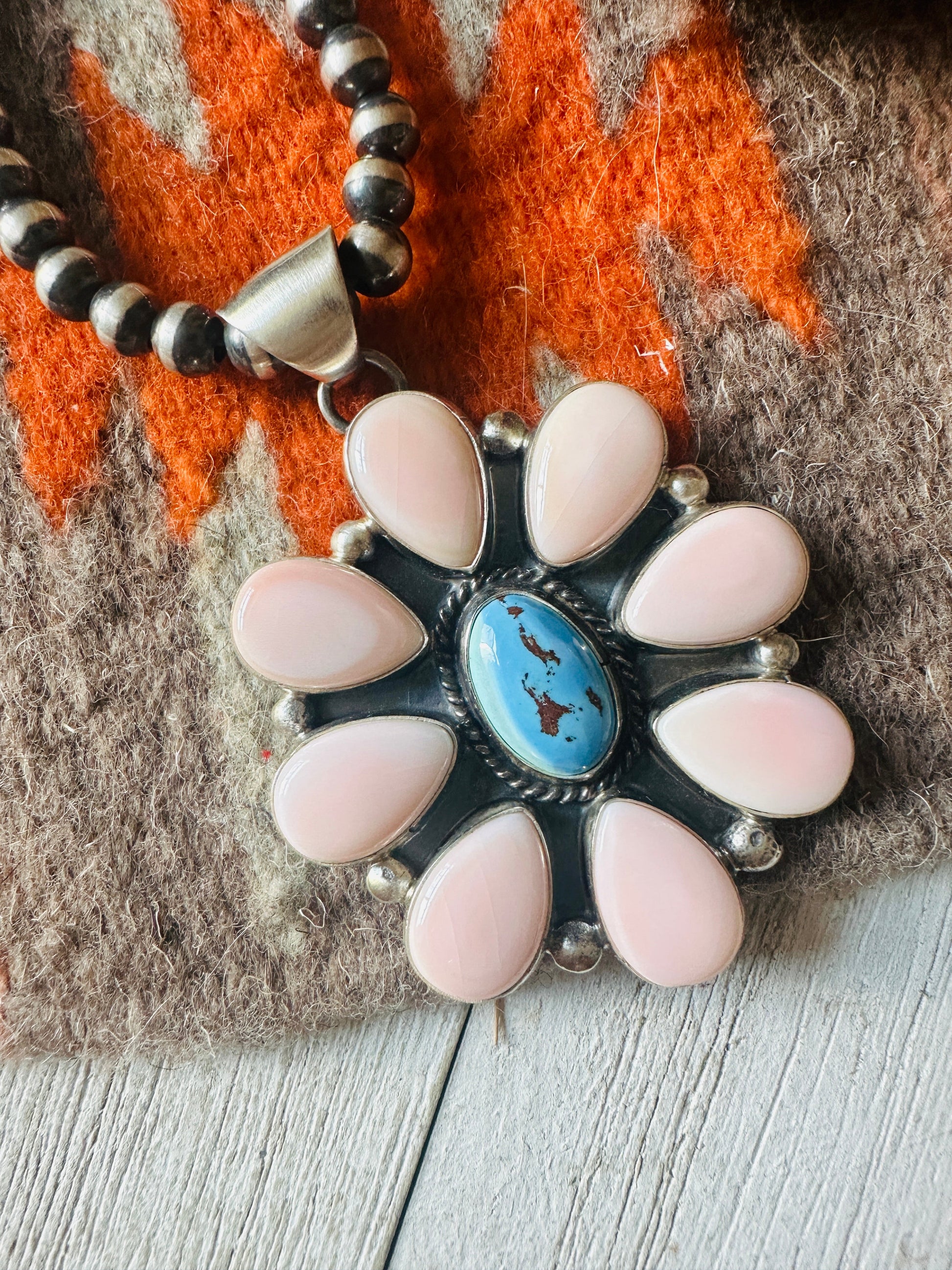 Navajo Queen Pink Conch, Turquoise & Sterling Silver Cluster Pendant