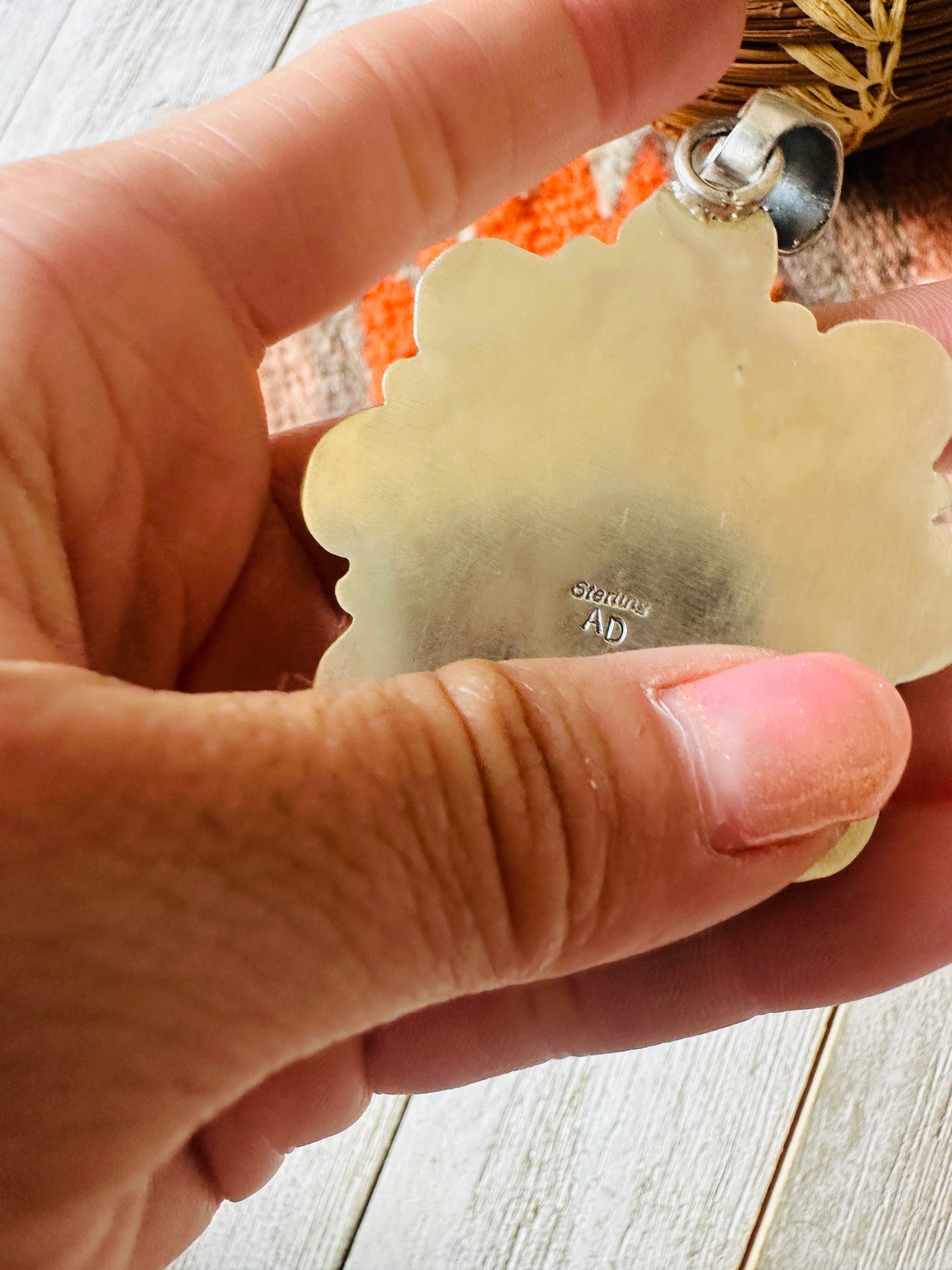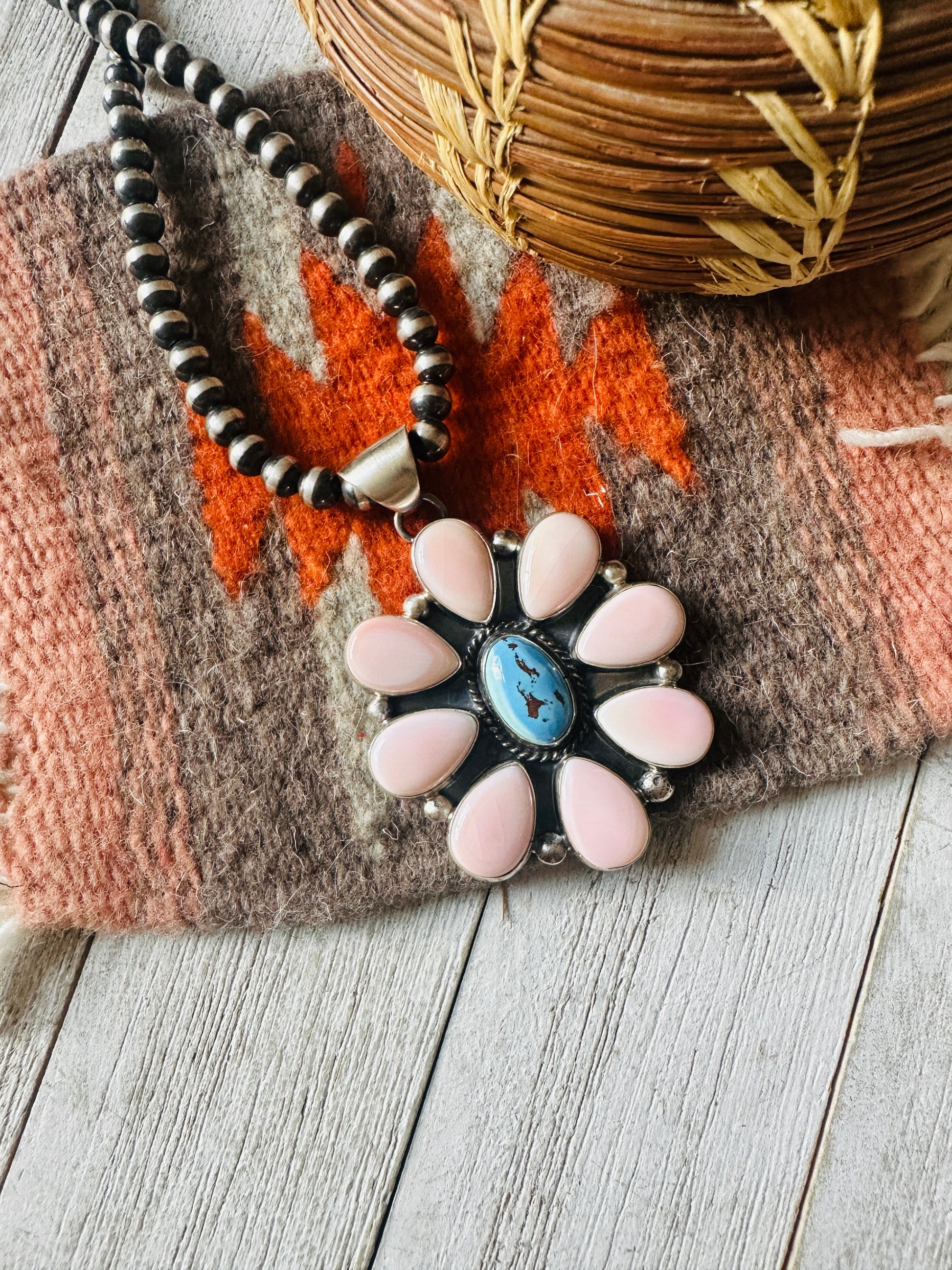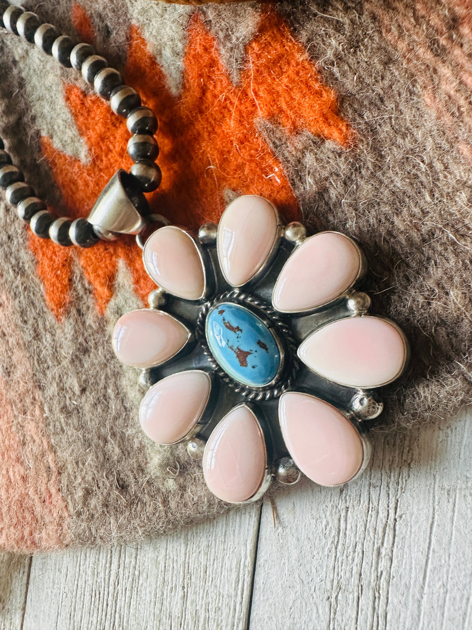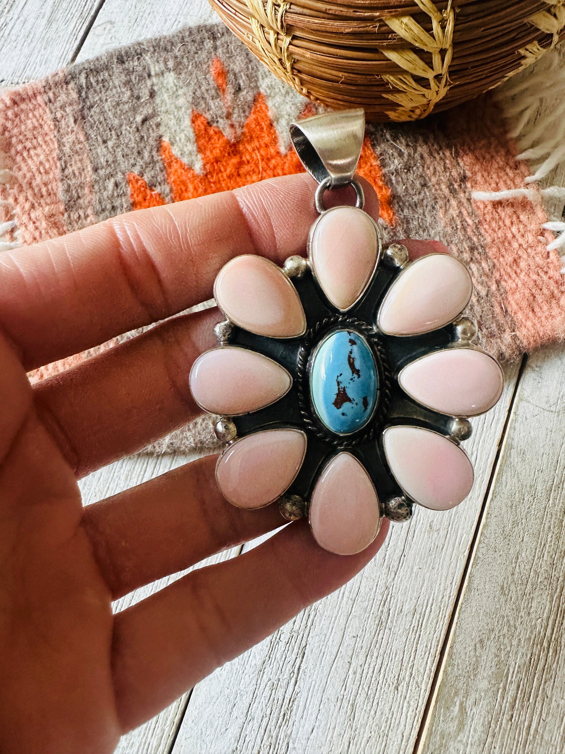 Navajo Queen Pink Conch, Turquoise & Sterling Silver Cluster Pendant