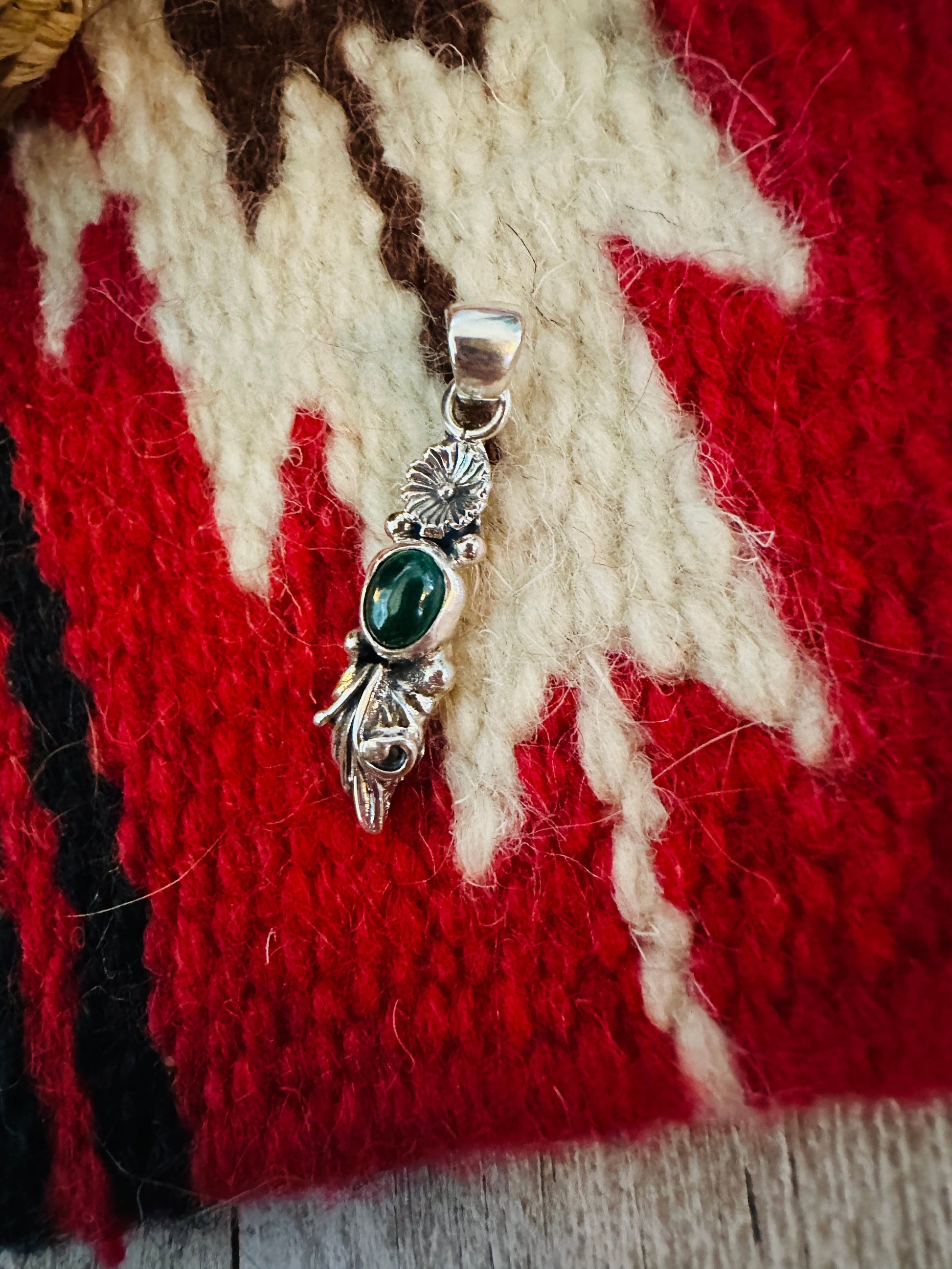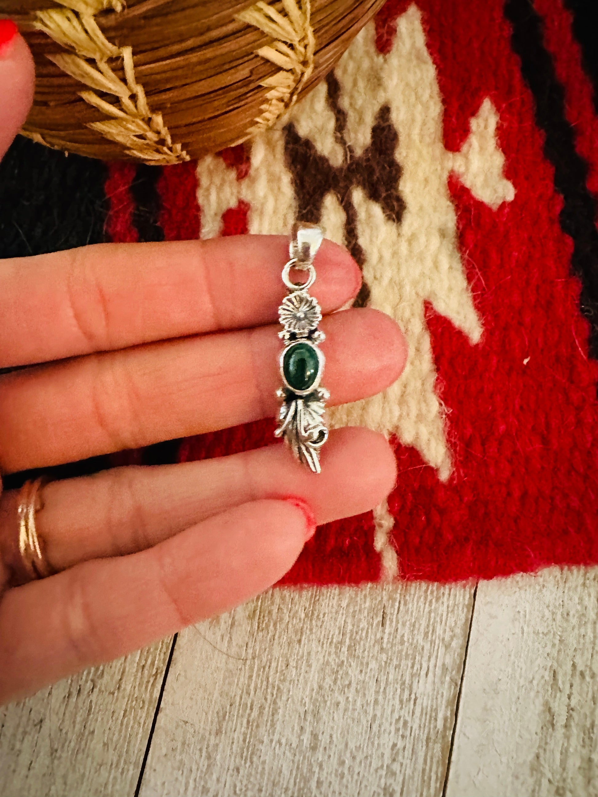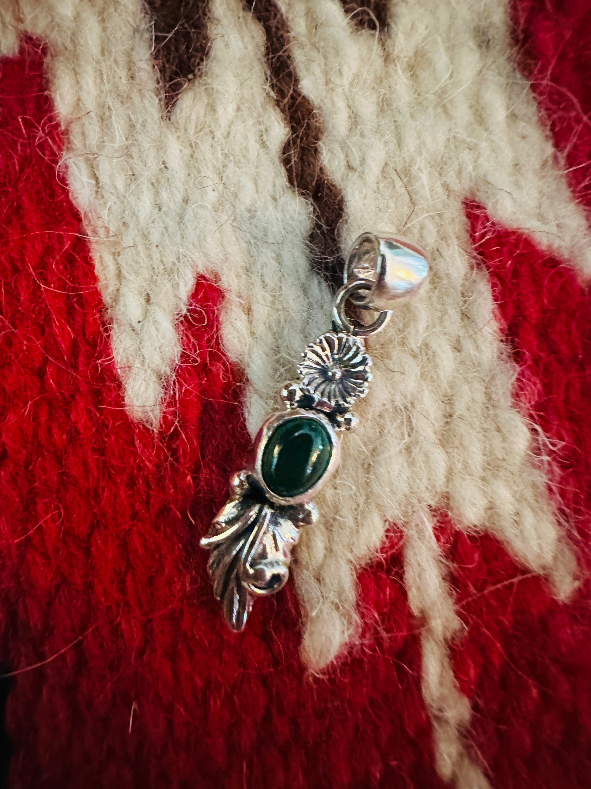 Beautiful Navajo Turquoise and Sterling Silver Flower Pendant. Pendant measures 1 1/2 inches long and 3/8 of an inch wide. Bale measures 1/8 of an inch across. Signed by the artist and stamped Sterling. Great pendant for your favorite chain.