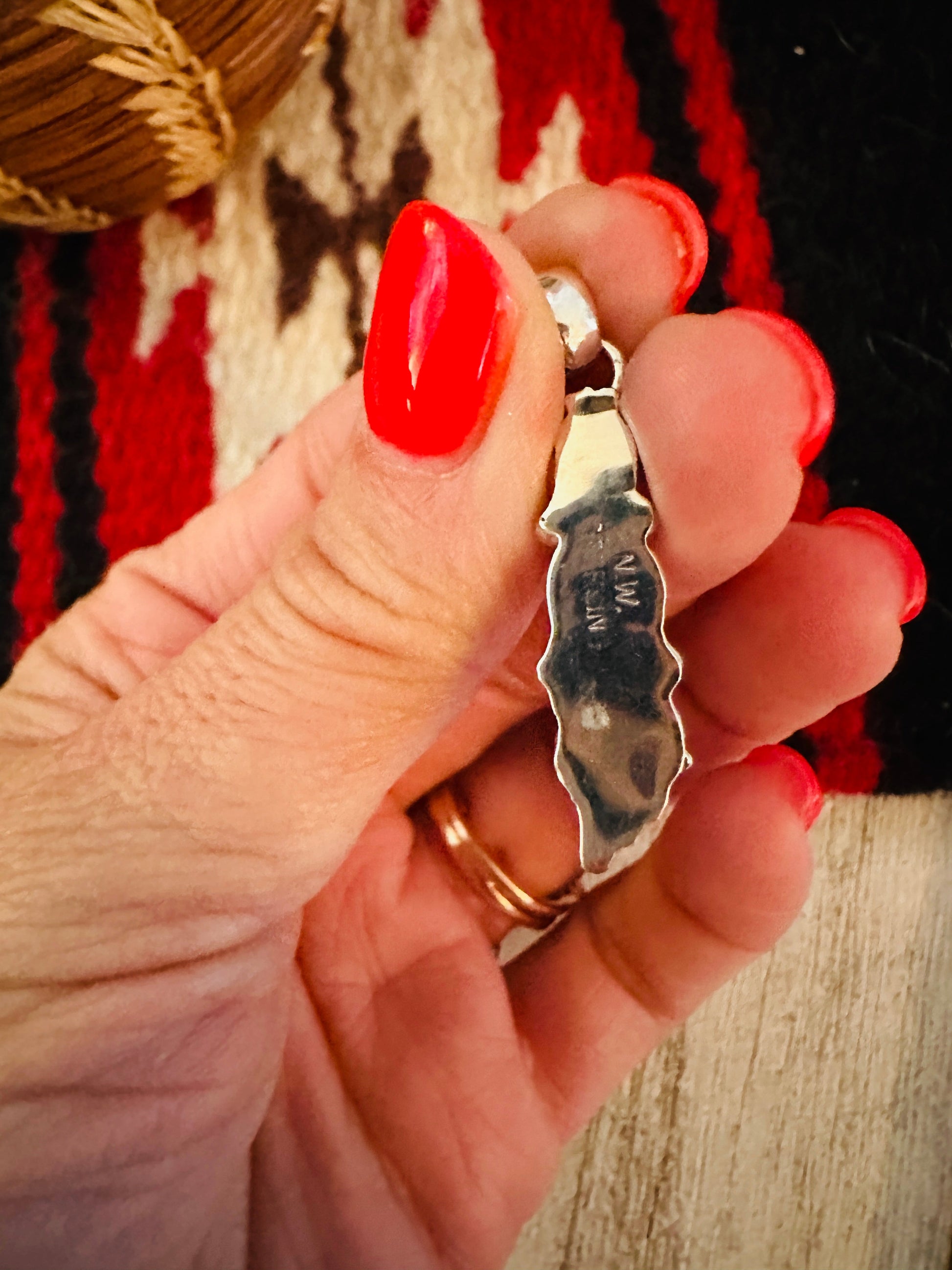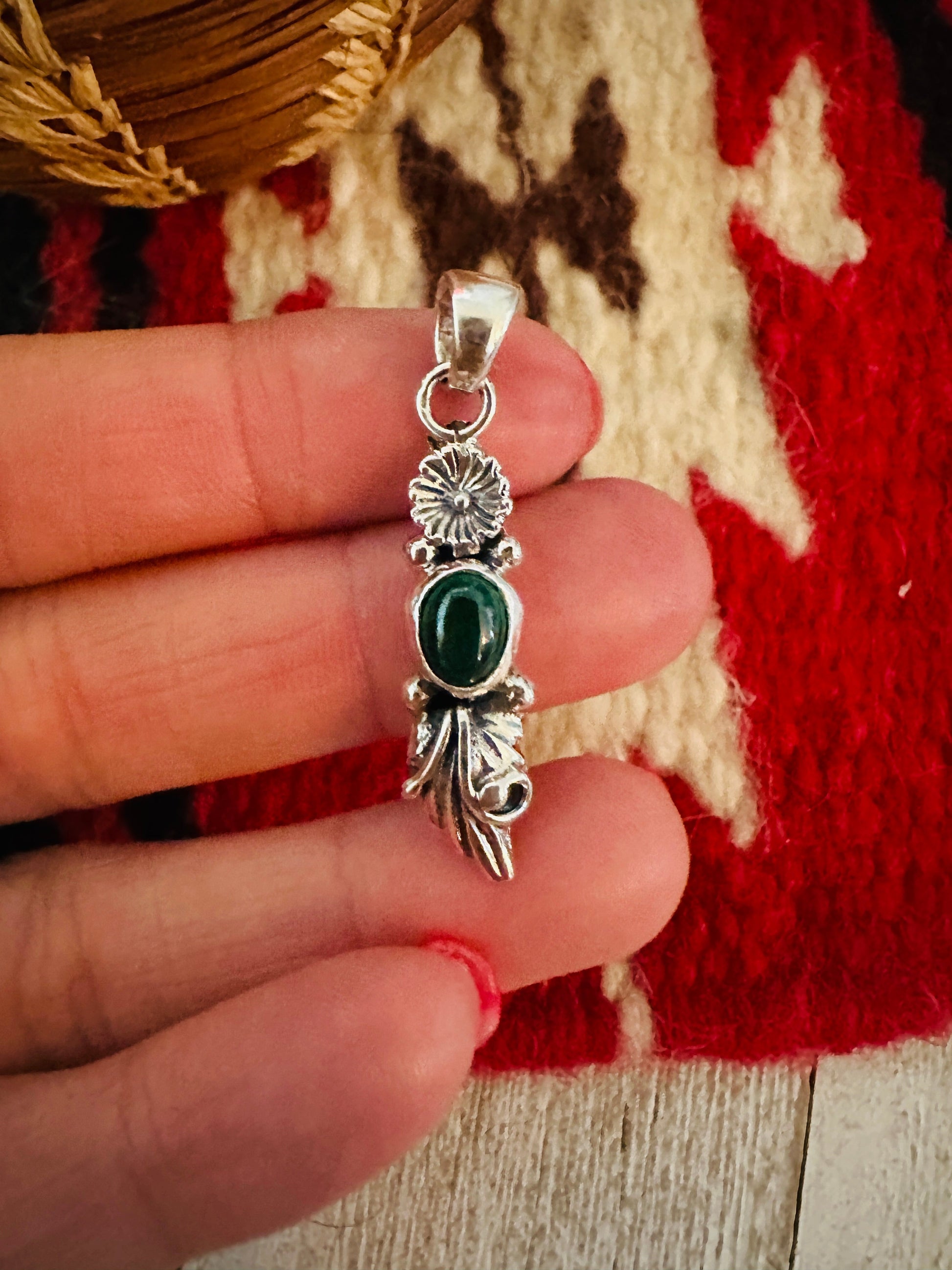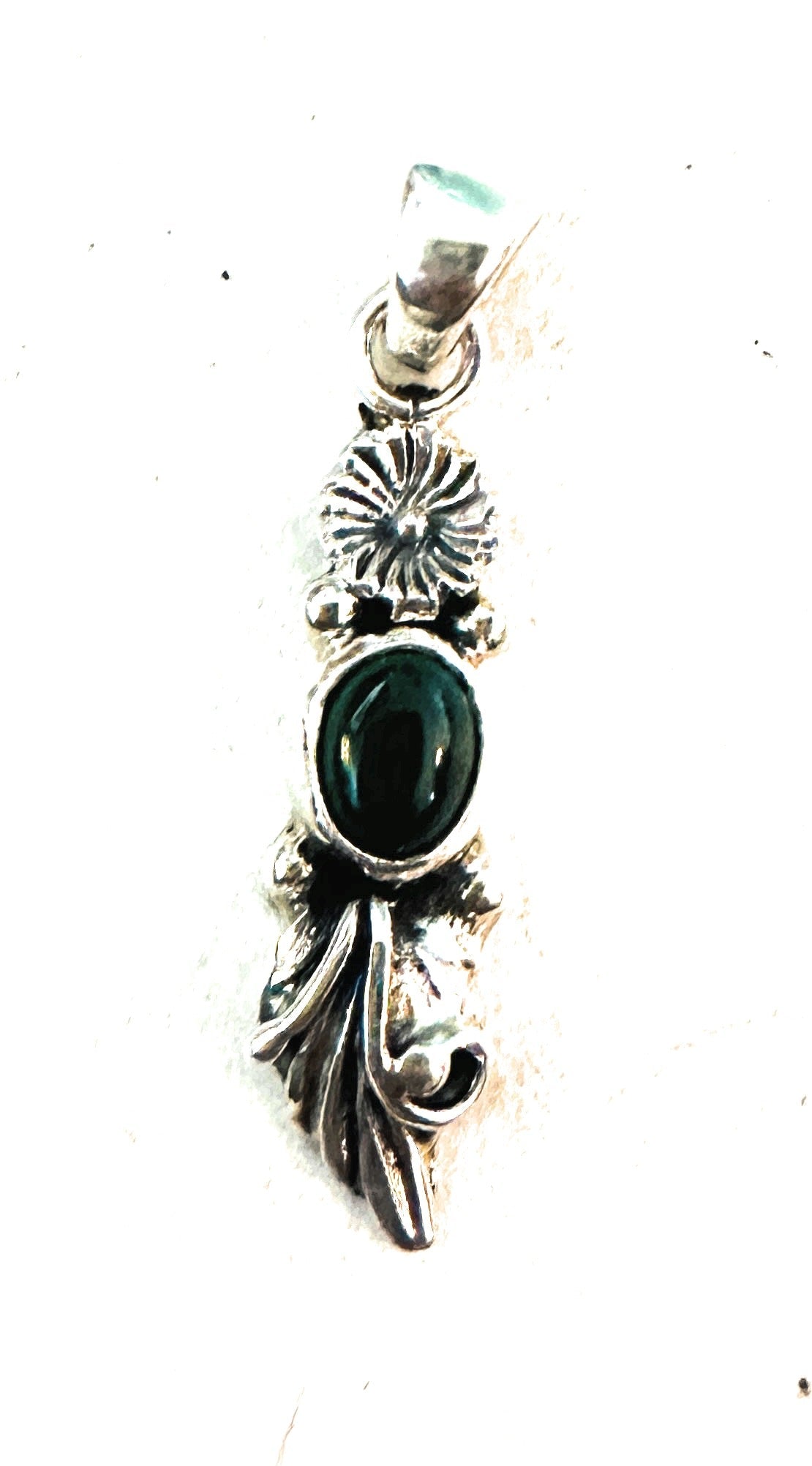 Beautiful Navajo Turquoise and Sterling Silver Flower Pendant. Pendant measures 1 1/2 inches long and 3/8 of an inch wide. Bale measures 1/8 of an inch across. Signed by the artist and stamped Sterling. Great pendant for your favorite chain.