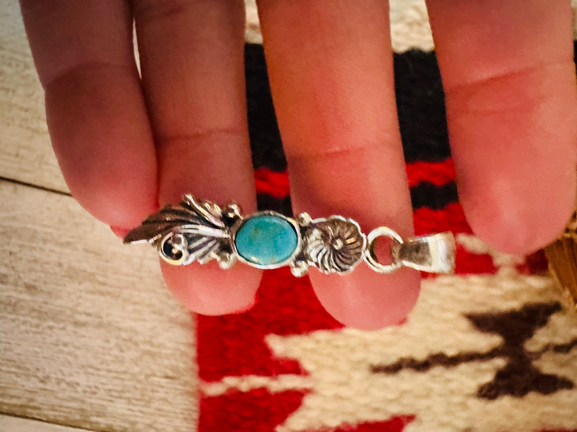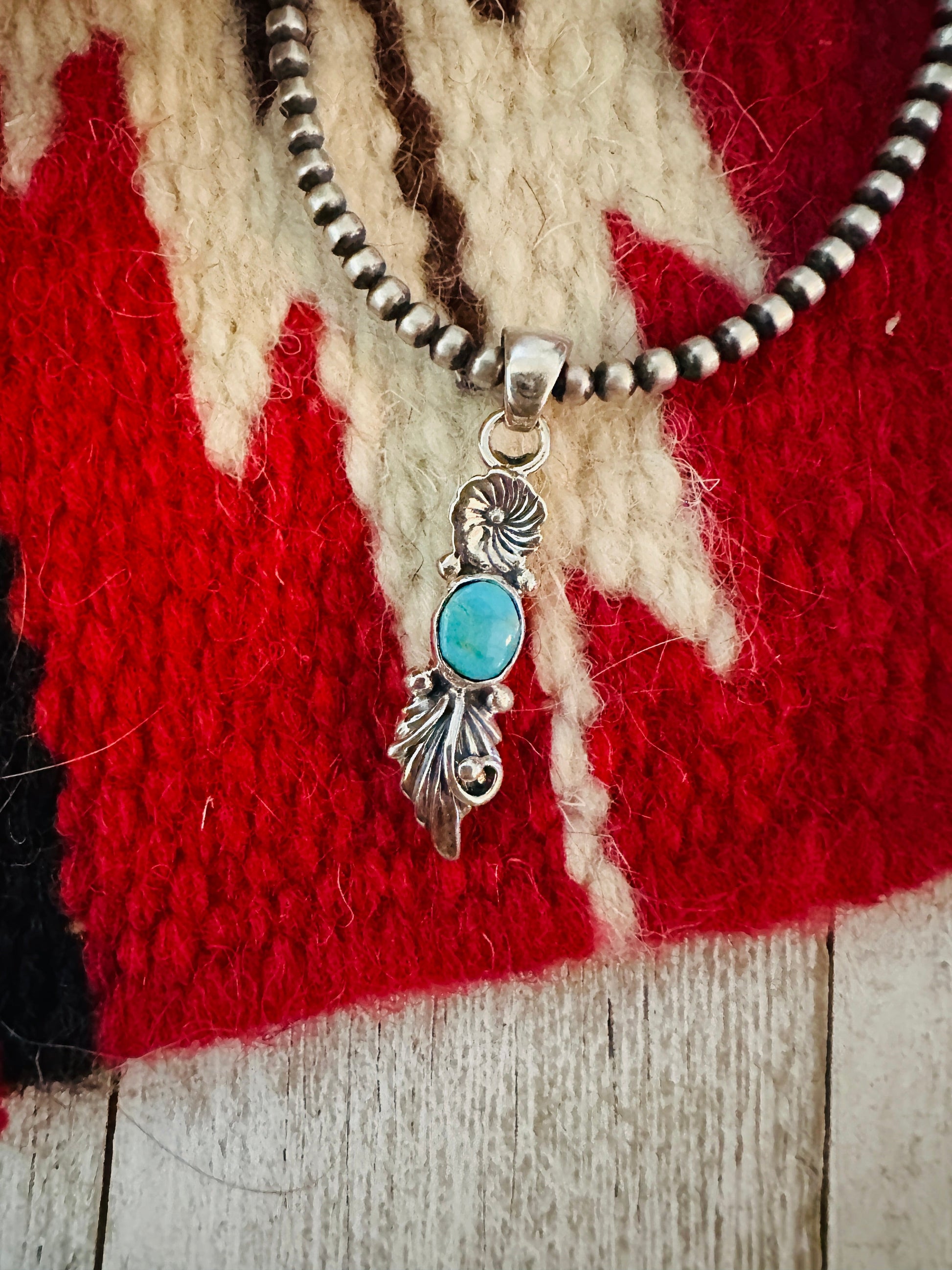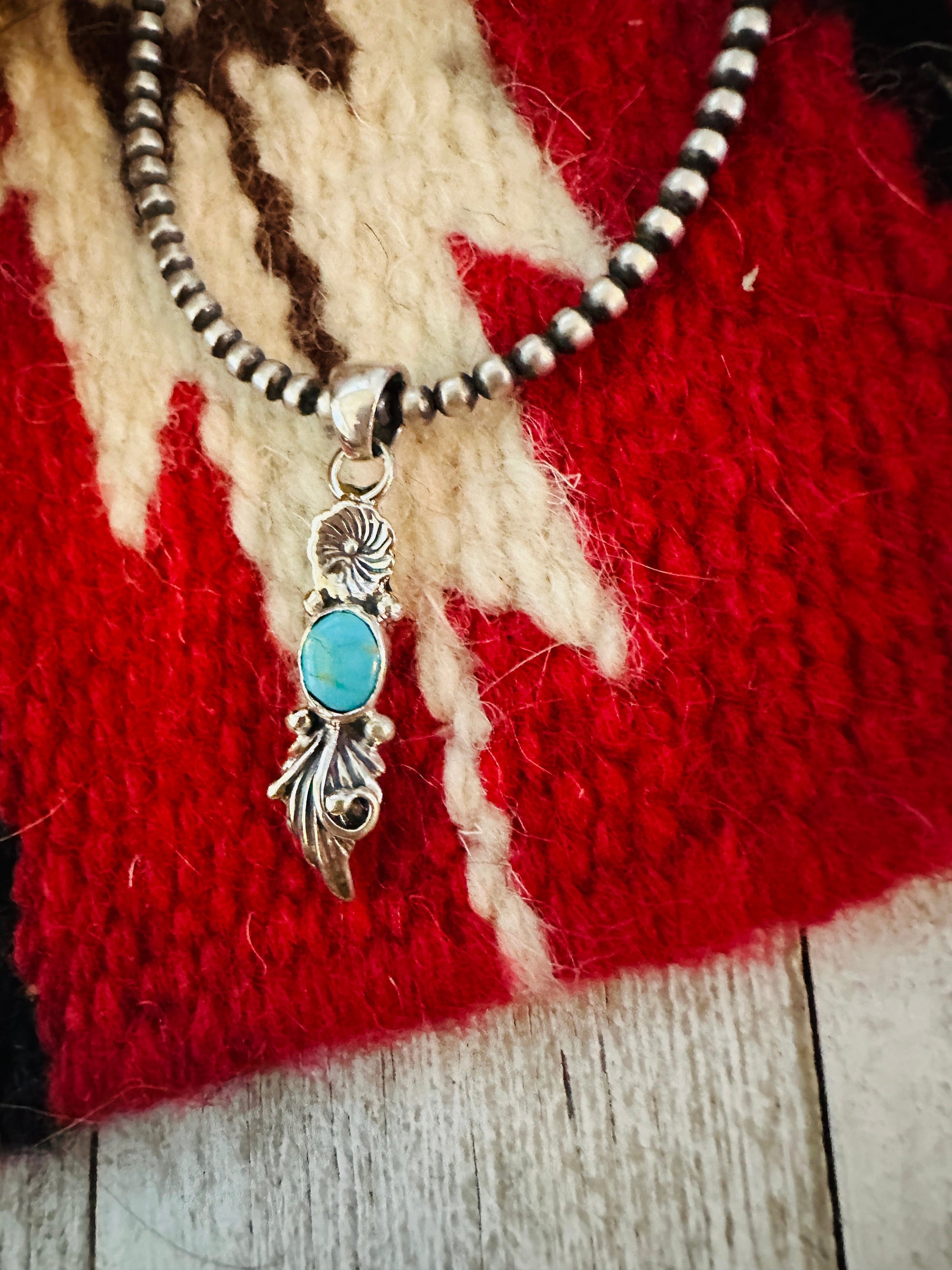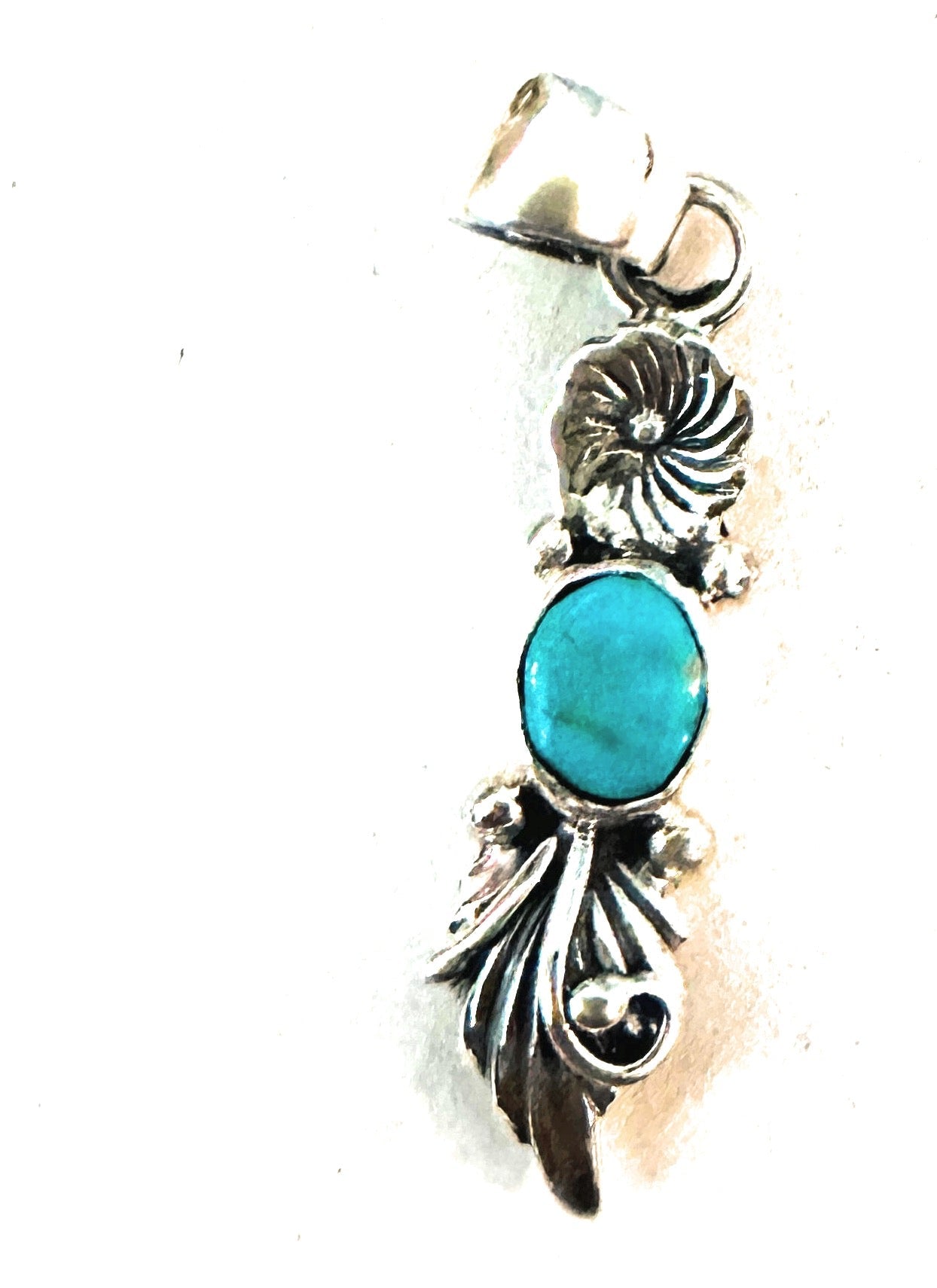 Beautiful Navajo Turquoise and Sterling Silver Flower Pendant. Pendant measures 1 1/2 inches long and 3/8 of an inch wide. Bale measures 1/8 of an inch across. Signed by the artist and stamped Sterling. Great pendant for your favorite chain.
