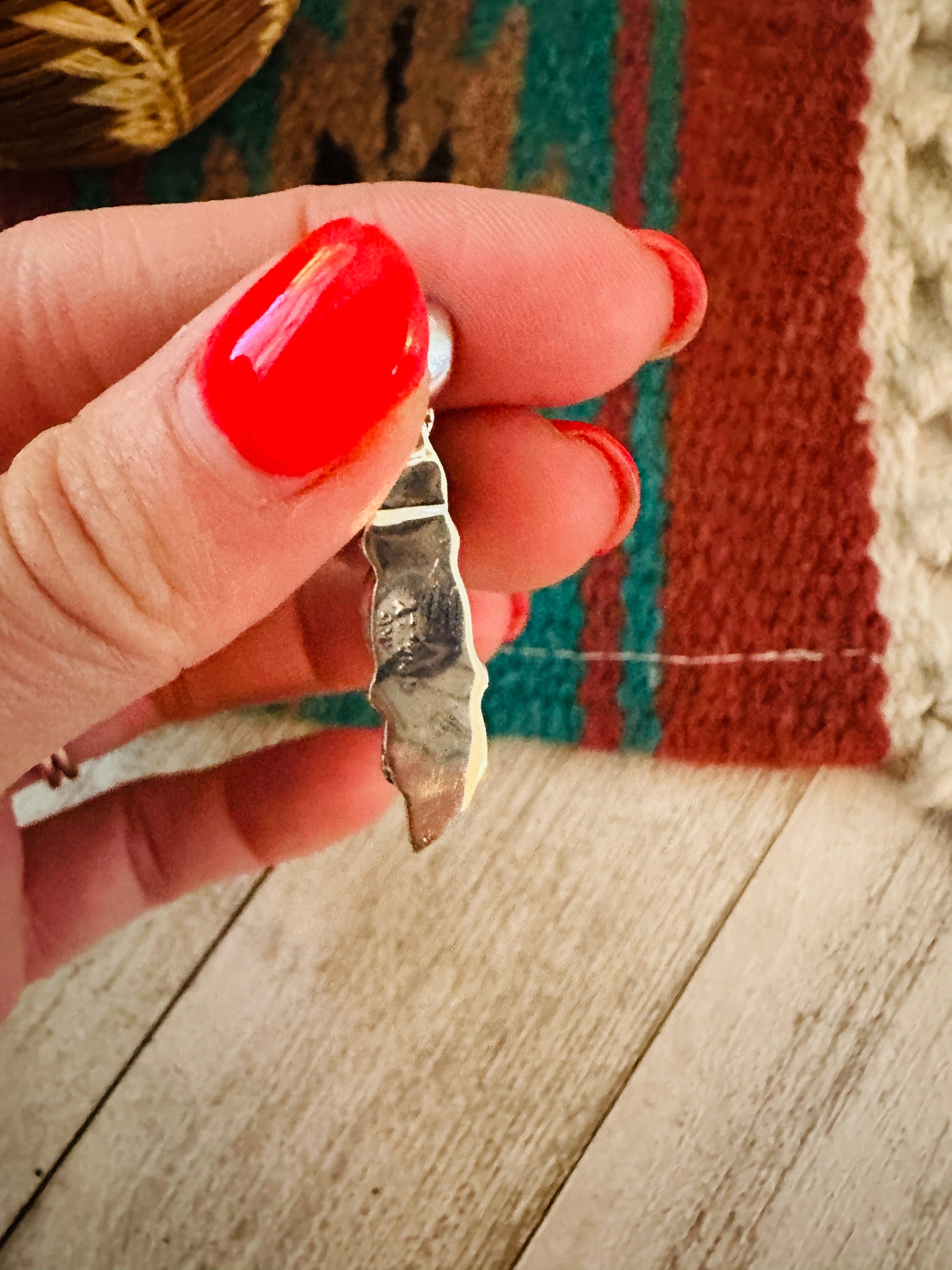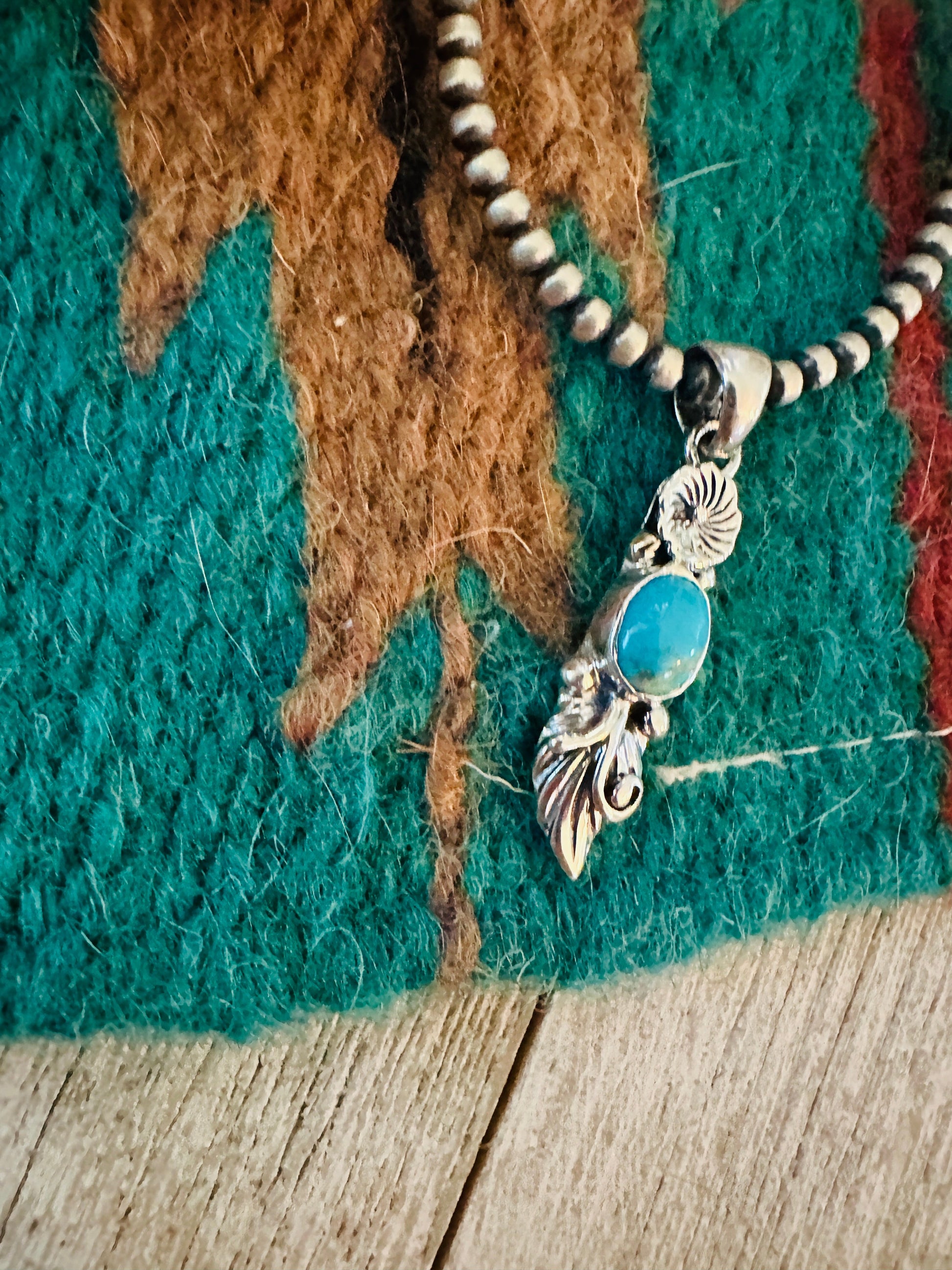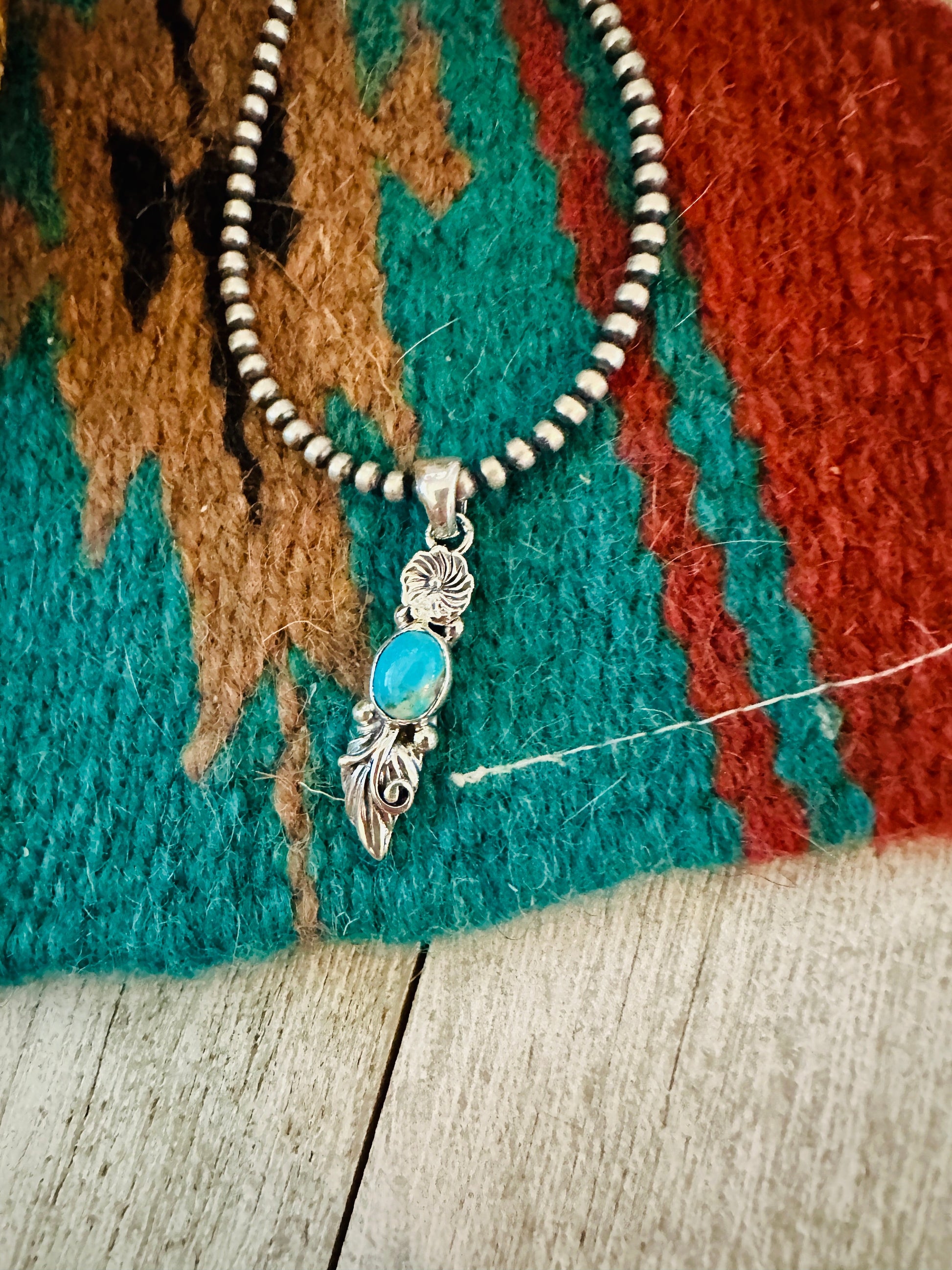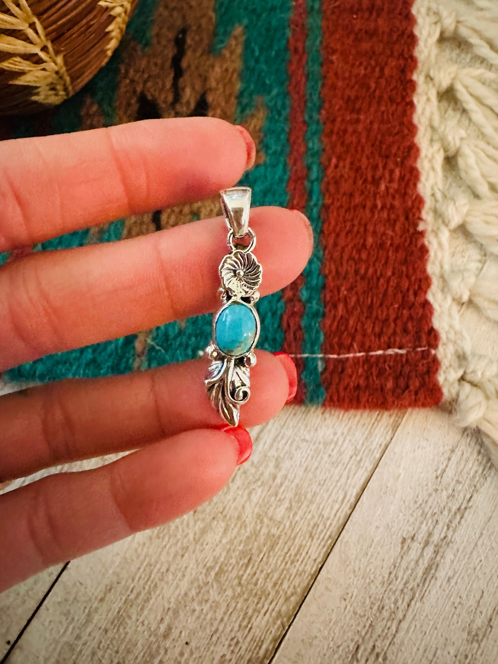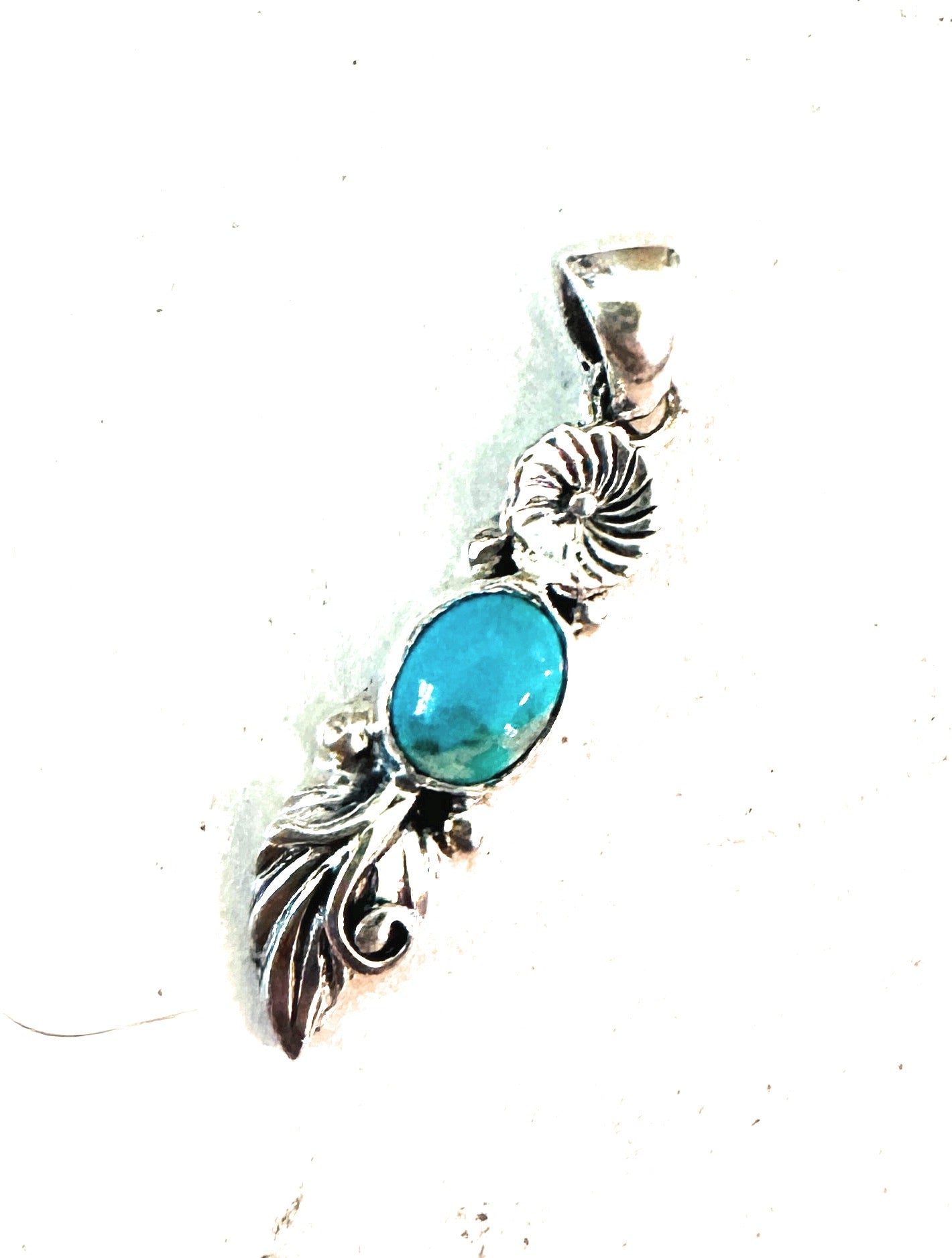 Beautiful Navajo Turquoise and Sterling Silver Flower Pendant. Pendant measures 1 1/2 inches long and 1/4 of an inch wide. Bale measures just over 1/8 of an inch across. Signed by the artist and stamped Sterling. Great pendant for your favorite chain.