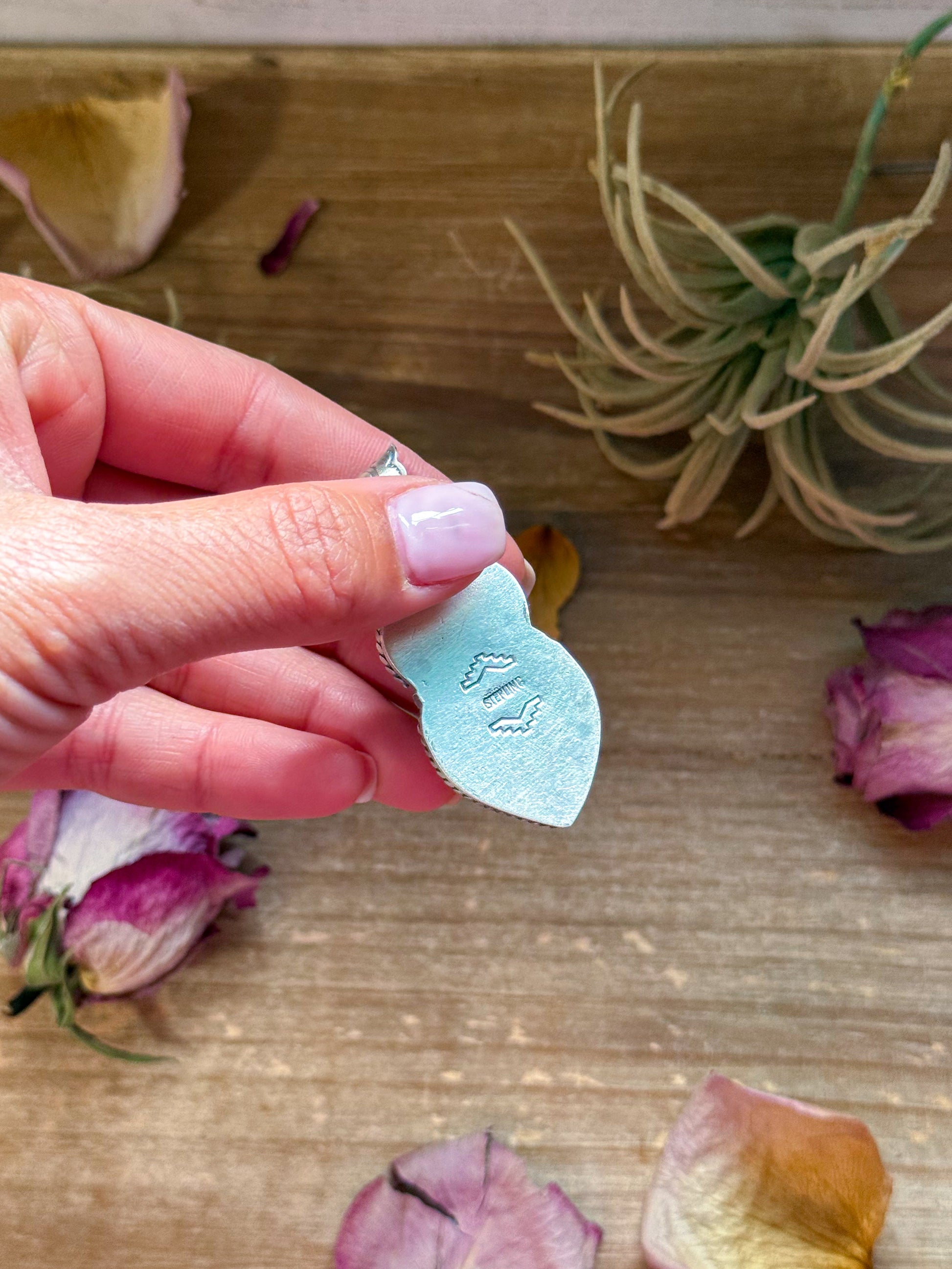 Handmade in New Mexico, USA, this mixed-stone pendant combines the rare beauty of Golden Hills turquoise with the soft blush of pink conch shell. The contrasting tones of cool lilac-blue and warm rose create a look that’s both elegant and playful — a perfect reflection of modern Southwestern charm.