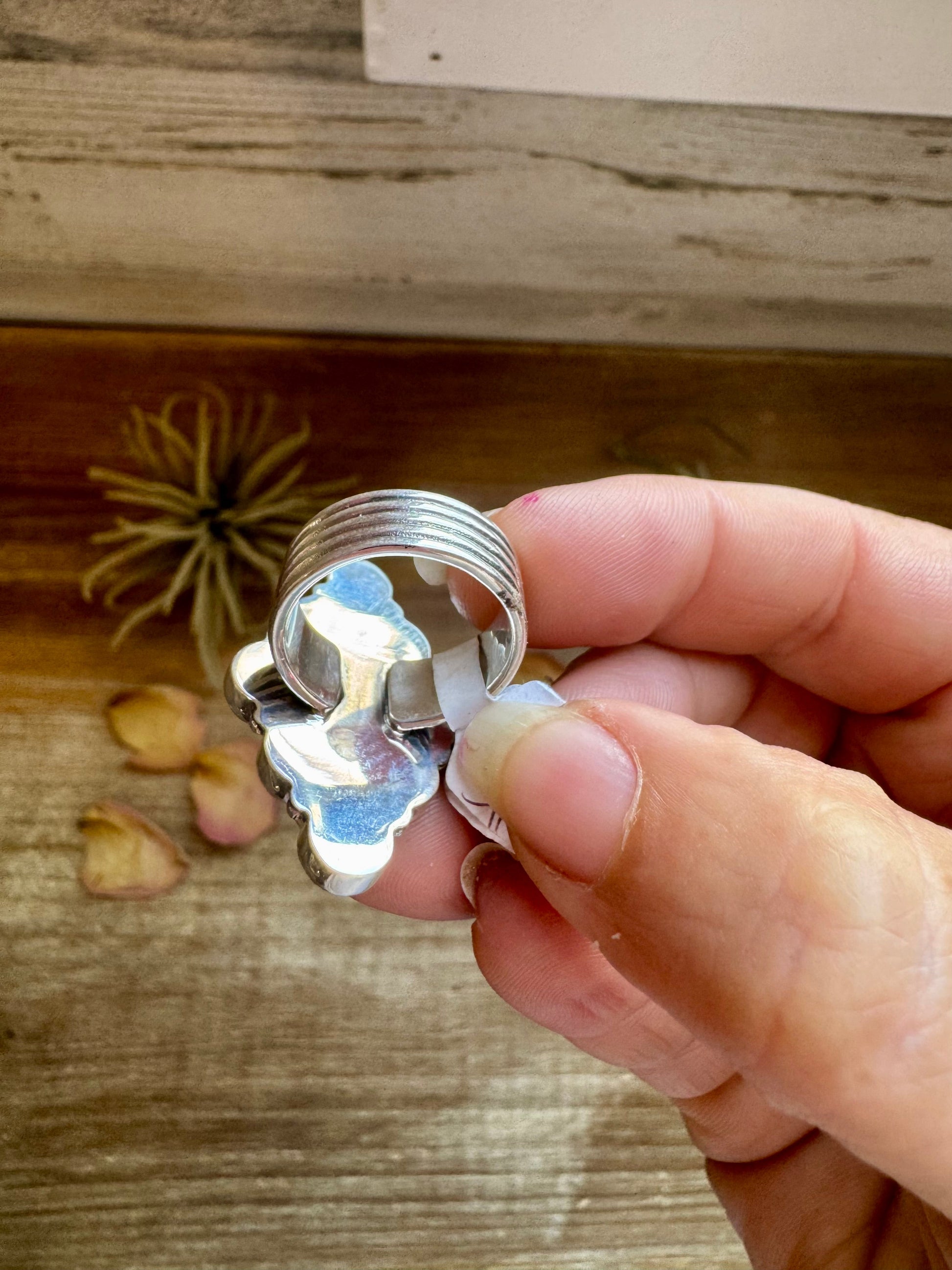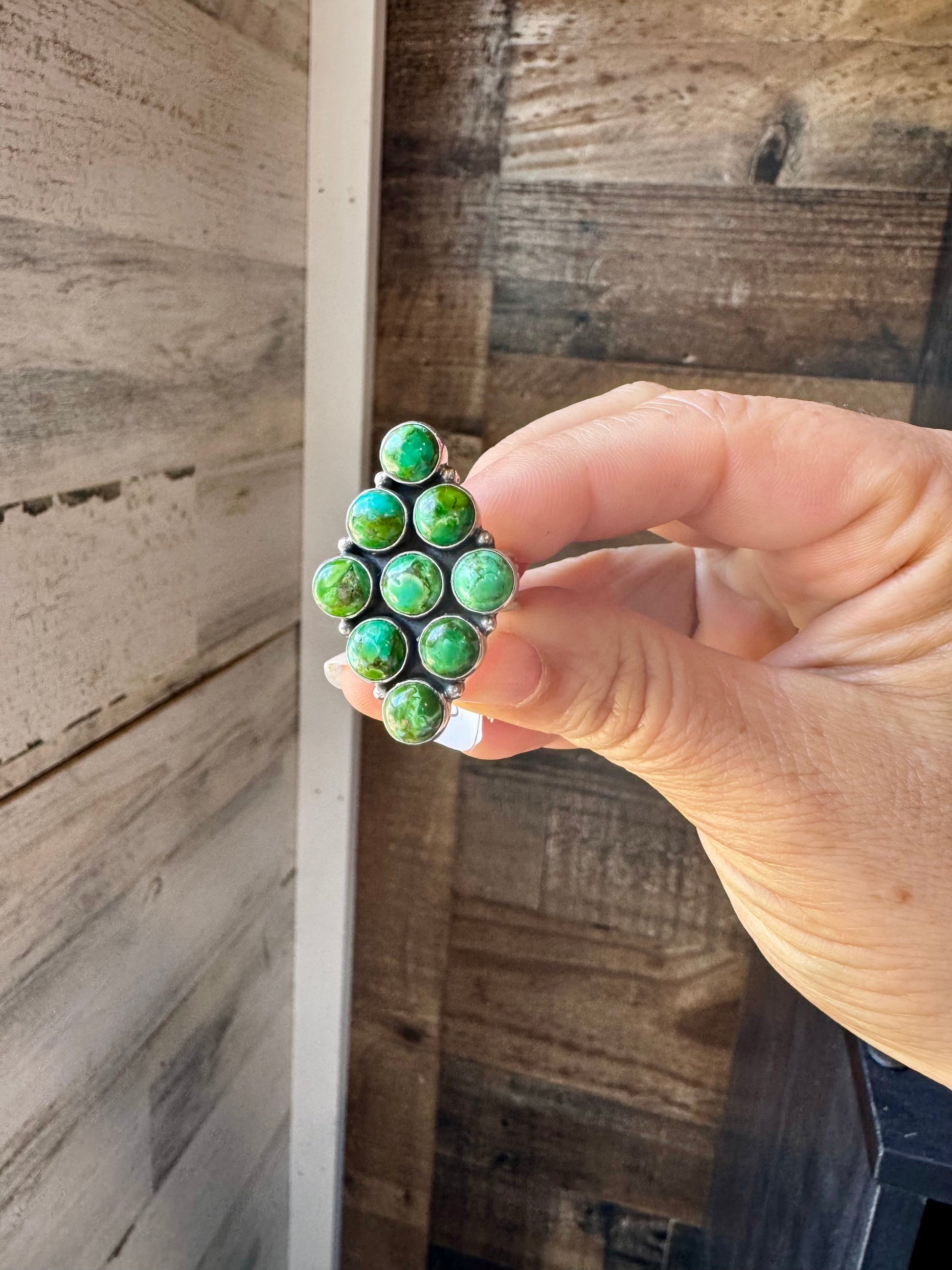This diamond-shaped green turquoise ring is full of bold character with clean lines and a vibrant pop of color. Crafted in sterling silver and made in the USA, it's a one-of-a-kind piece that blends simplicity with Southwestern edge.
