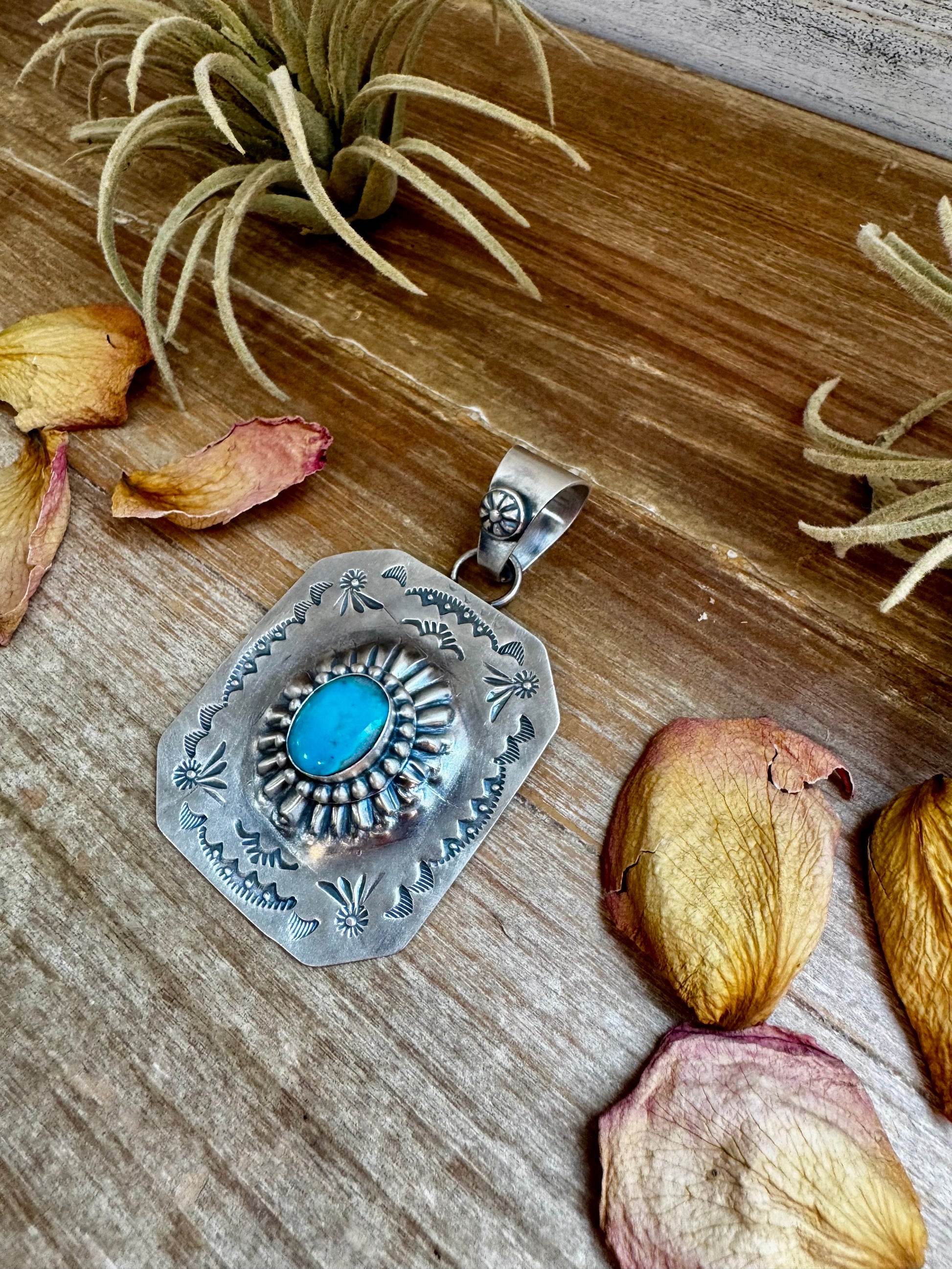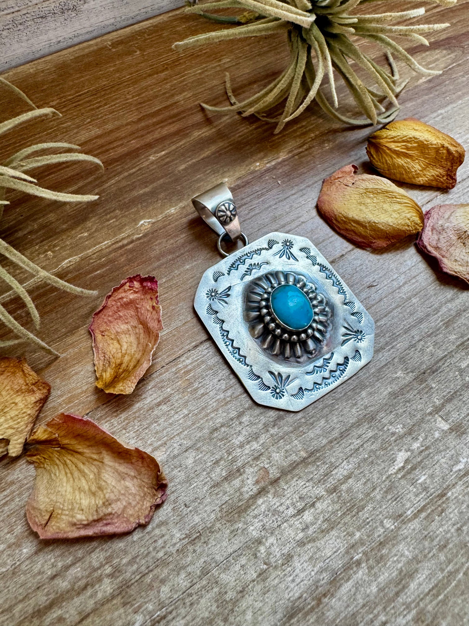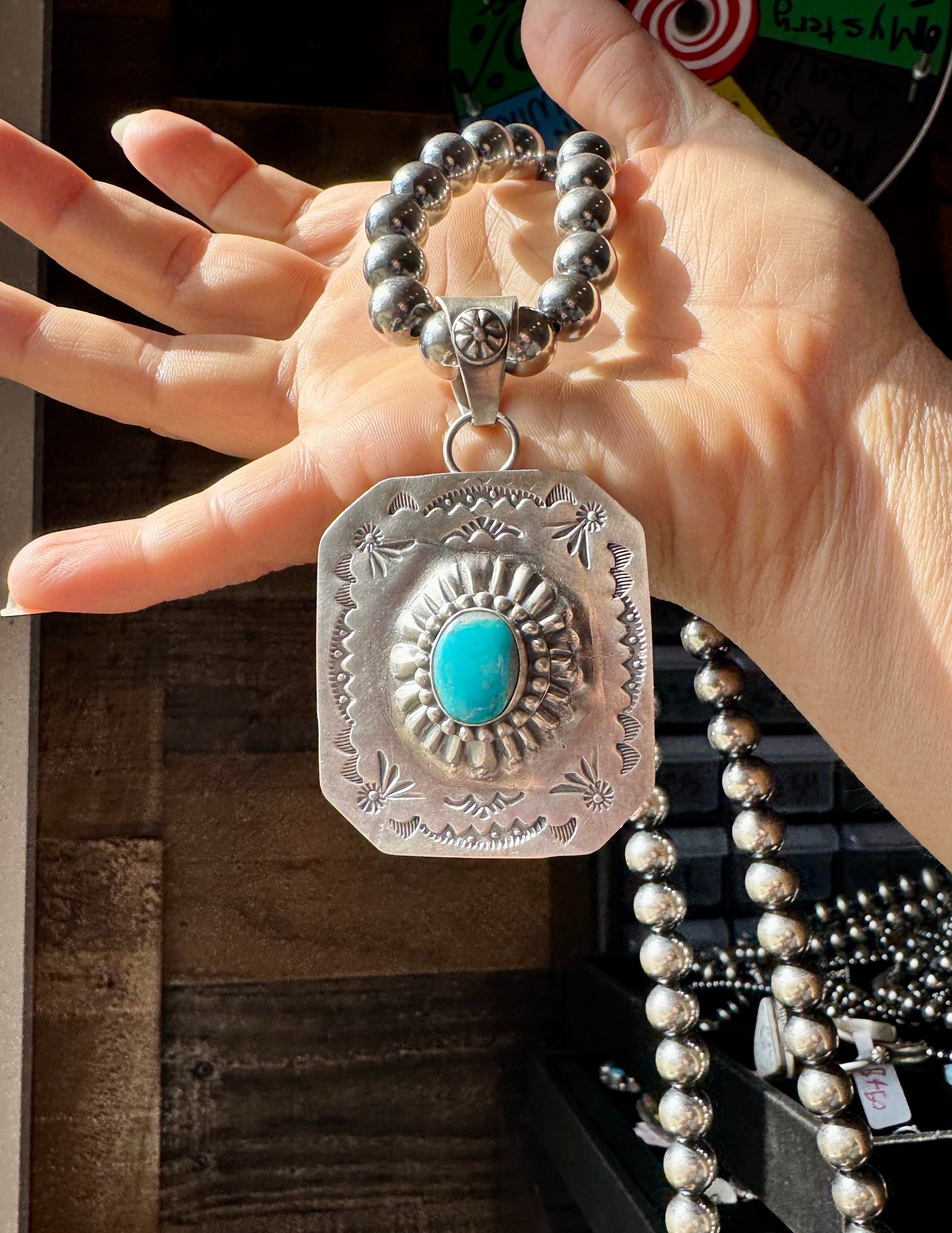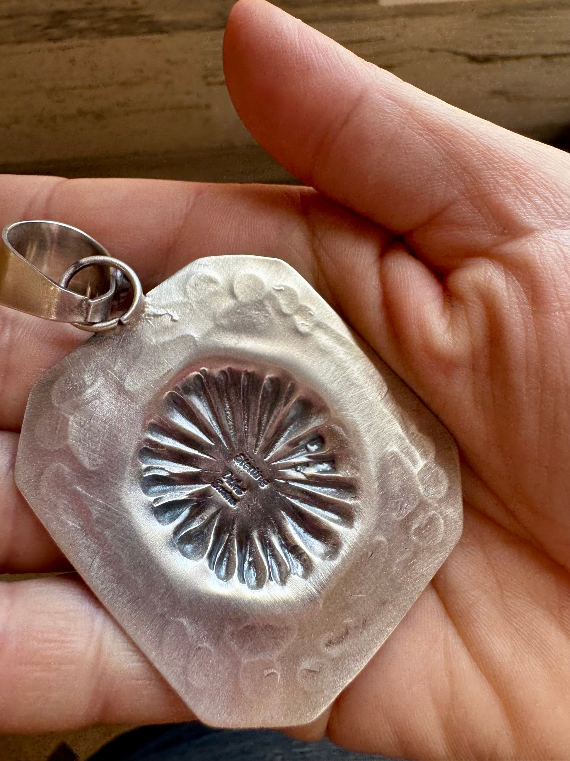 This bold rectangle pendant is a true standout. Measuring approximately 3 inches long by 2 inches wide, it features incredible hand-stamped detailing that brings out the character of the sterling silver. Stamped on the back with “Sterling” and artist’s signature, it fits up to 12mm pearls or chains. A striking piece for layering or wearing solo.