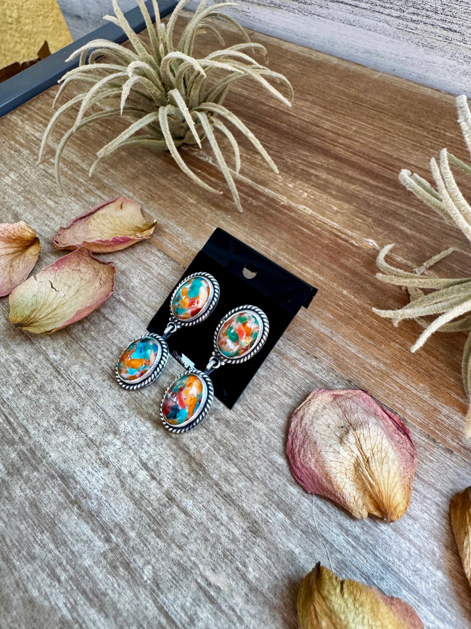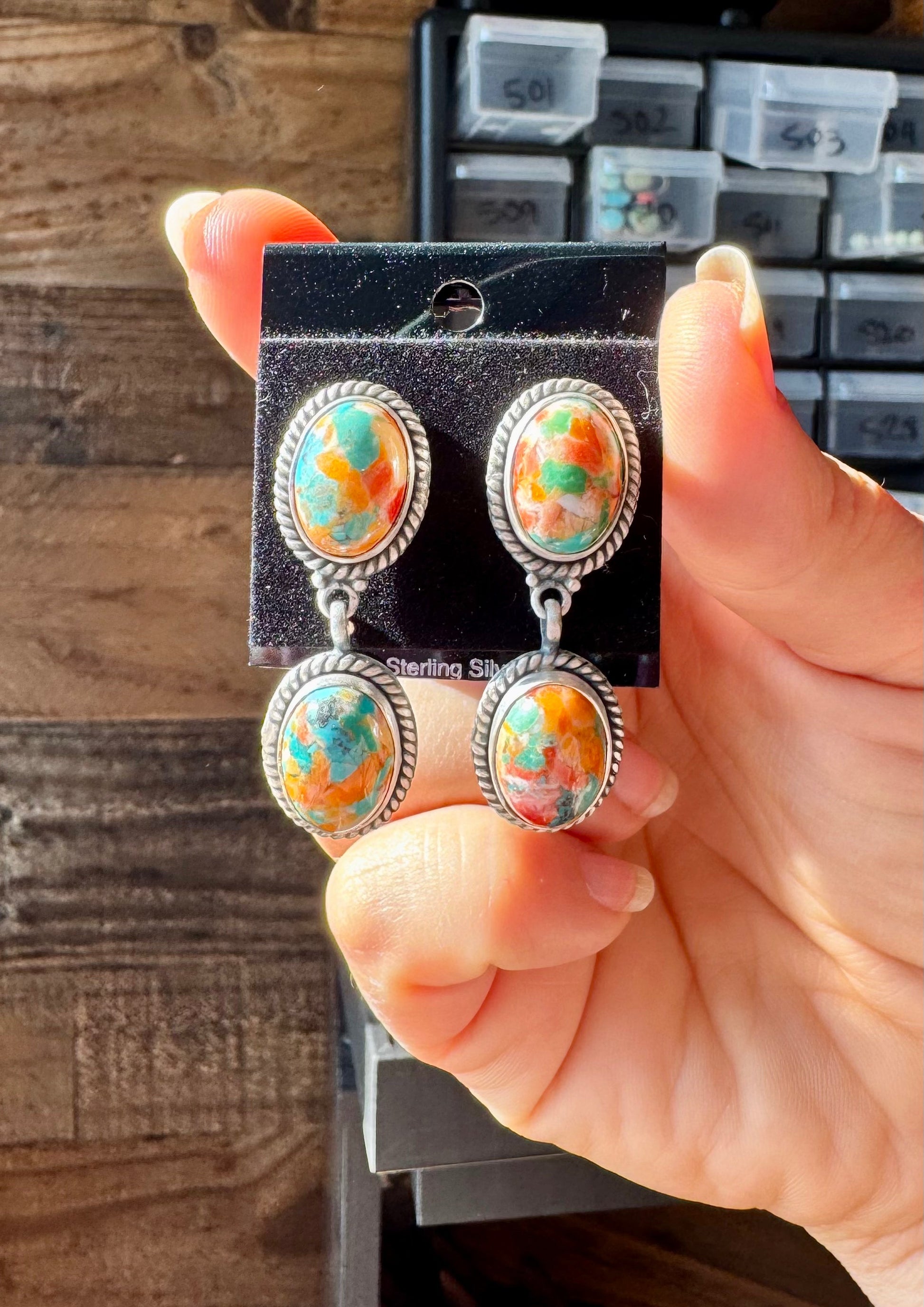 A pop of color like no other. These bold dangle earrings feature a stunning fusion of Mojave spiny oyster and turquoise, full of vibrant, fun tones that make every pair completely unique. Crafted in sterling silver with a post on top, they bring the perfect statement to your everyday look or your favorite rodeo fit.