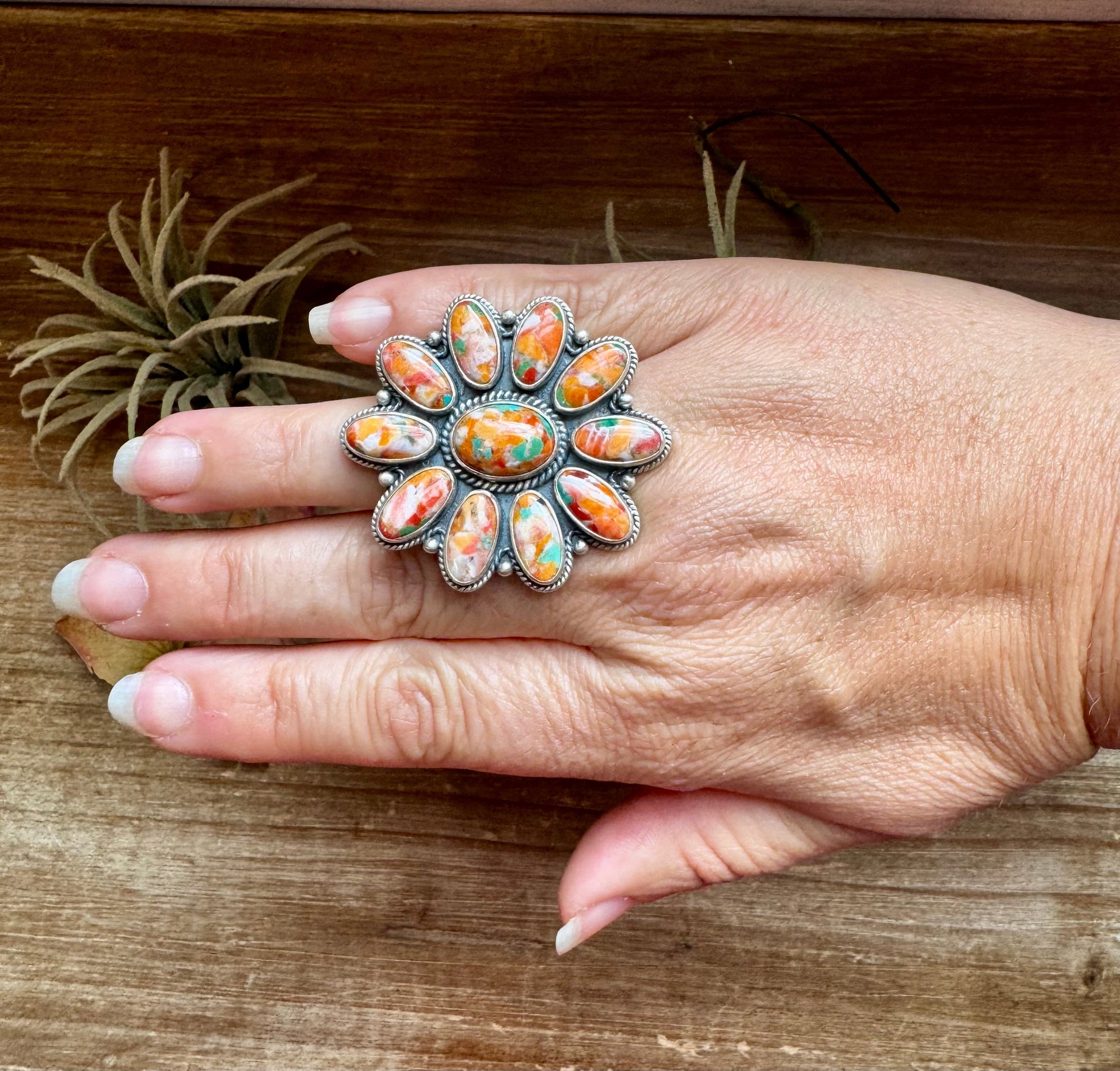 Bold, bright, and absolutely one of a kind. This sterling silver flower-shaped ring features a stunning mix of Mojave spiny oyster and turquoise stones, creating a colorful bloom that commands attention. Handmade in the USA, this ring is adjustable and fits comfortably while making a serious statement.