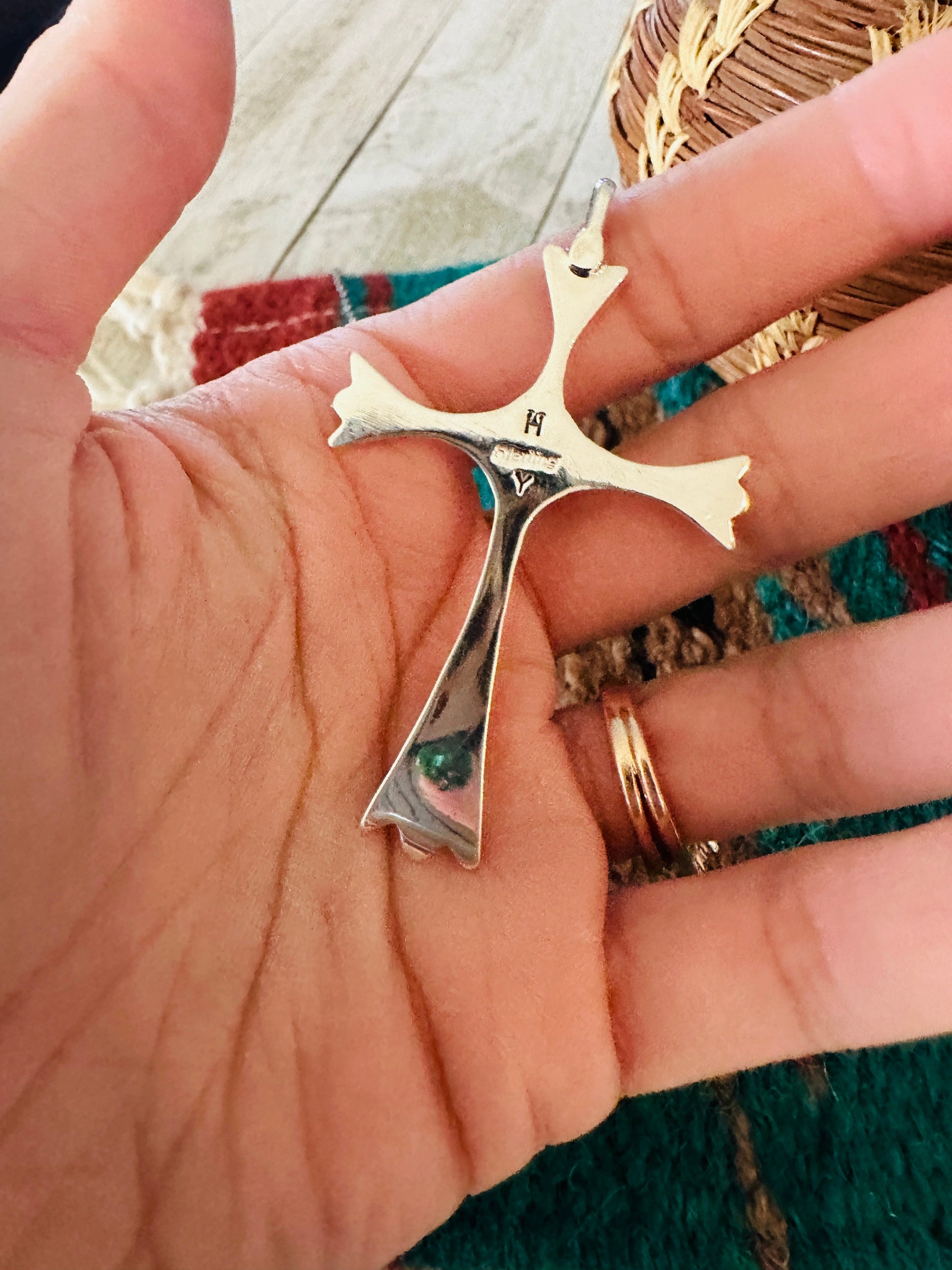 Navajo Handmade Sterling Silver and Black Onyx Cross Pendant. Such beautiful craftsmanship on this pendant! Pendant measures 2 3/8 inches long and 1 5/8 inches wide. Bale measures just under 1/8 of an inch across. Signed by the artist and stamped Sterling.