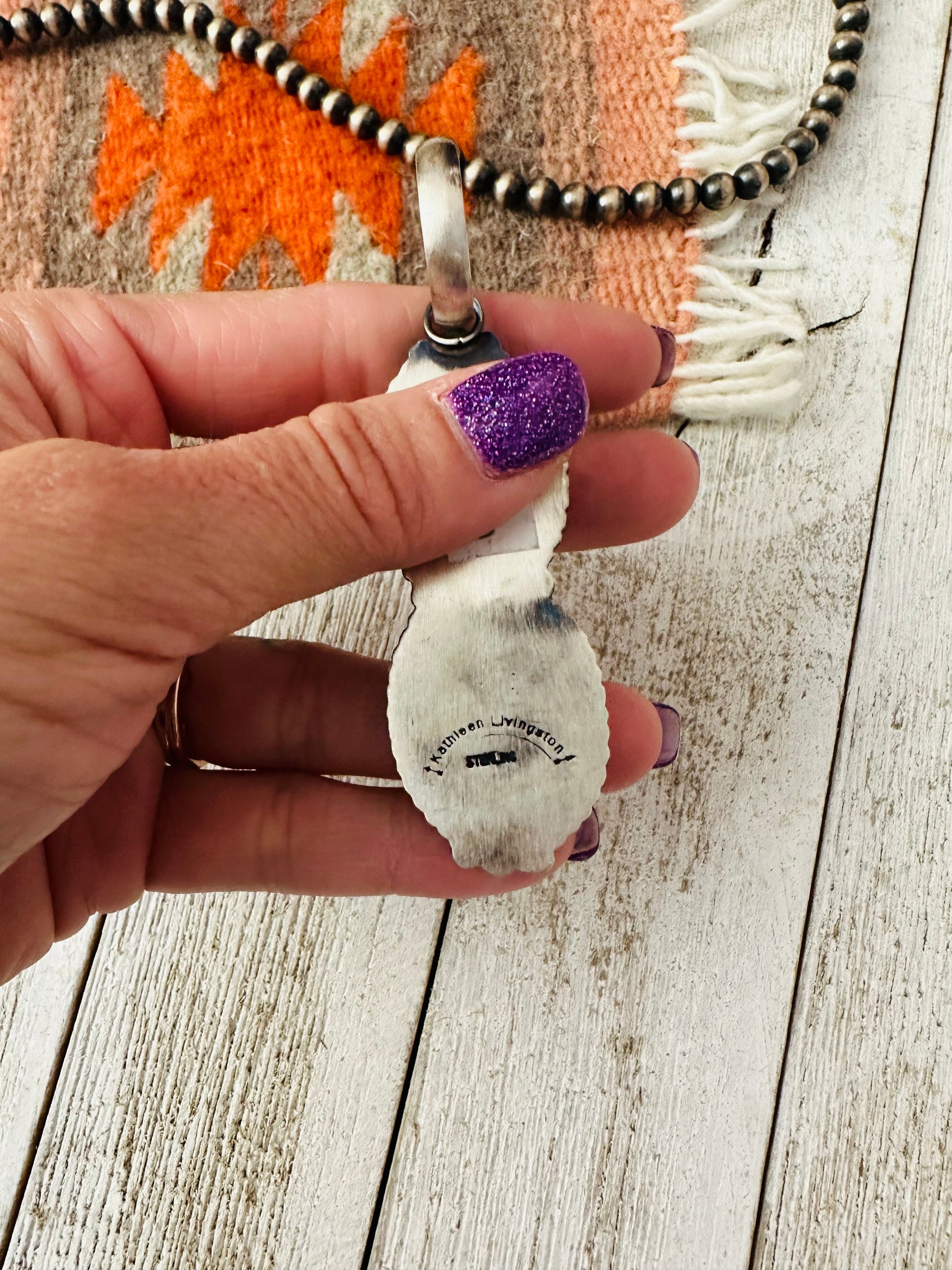 Gorgeous Navajo Sterling Silver and Golden Hills Turquoise Pendant. Such beautiful stones in this piece! Pendant measures 3 3/8 inches long and 1 inch wide. Bale is just over 5/8 of an inch across. Stamped Sterling & signed by the artist Kathleen Livingston.