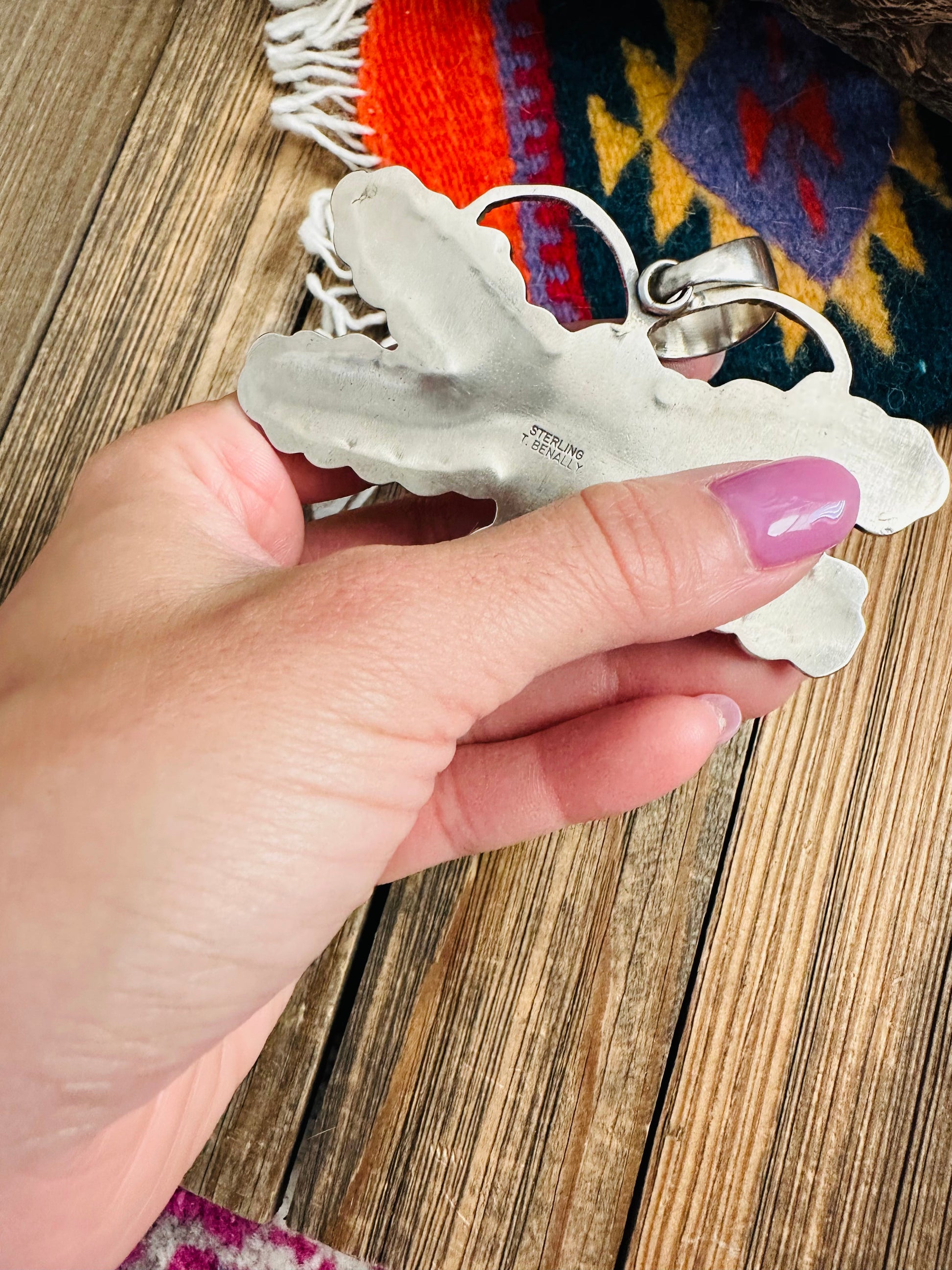 Awesome Navajo Sterling Silver and Queen Pink Conch Shell Dragonfly Pendant. Such beautiful craftsmanship! Pendant measures 3 3/4 inches long and 3 3/8 inches wide. Bale is 5/8 inch across. Stamped Sterling and signed by the artist.