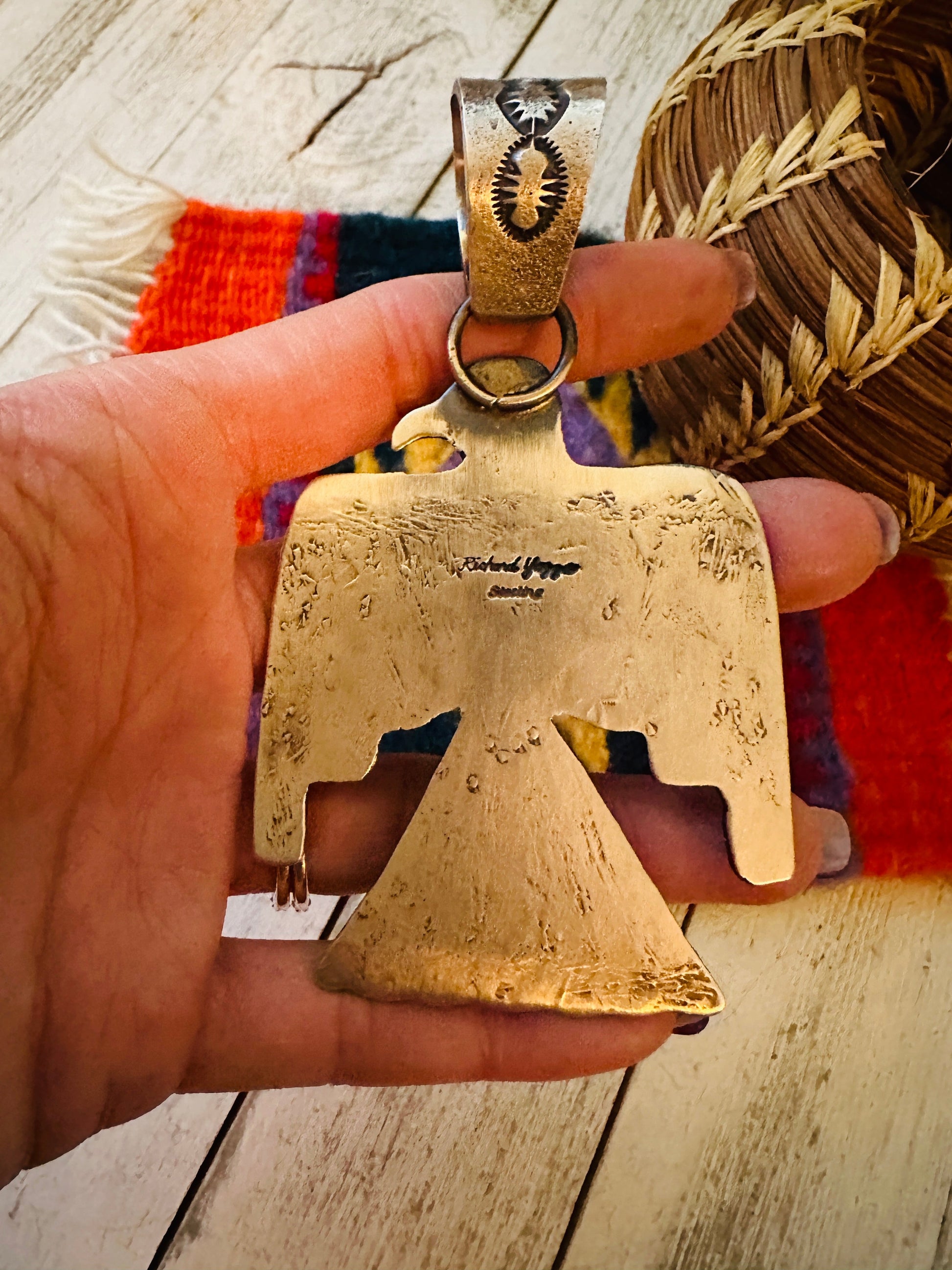 Awesome Navajo Sterling Silver and Queen Pink Conch Shell Thunderbird Pendant. Such beautiful craftsmanship! Pendant measures 3 7/8 inches long and 2 1/4 inches wide. Bale is 3/4 inch across. Stamped Sterling & Signed by the artist Richard Yazzie.