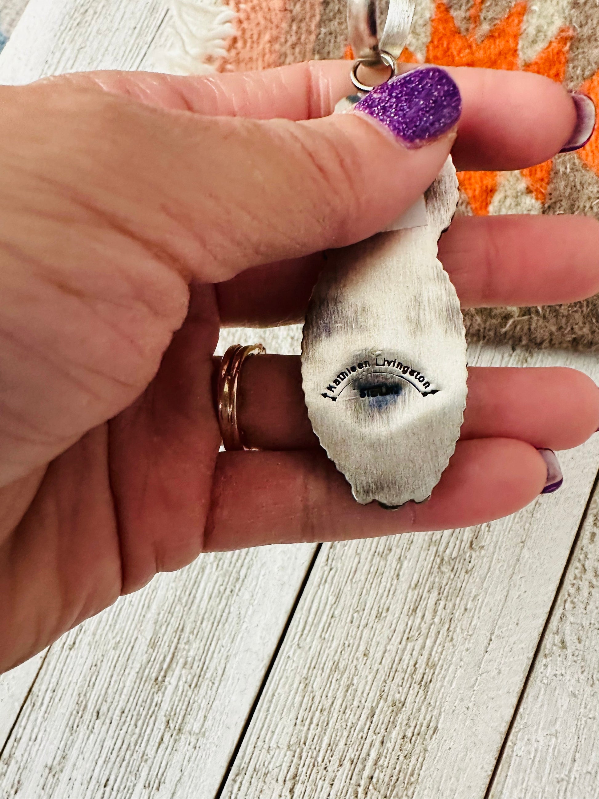 Gorgeous Navajo Sterling Silver and Golden Hills Turquoise Pendant. Such beautiful stones in this piece! Pendant measures 3 1/2 inches long and 1 inch wide. Bale is just over 5/8 of an inch across. Stamped Sterling & signed by the artist Kathleen Livingston.