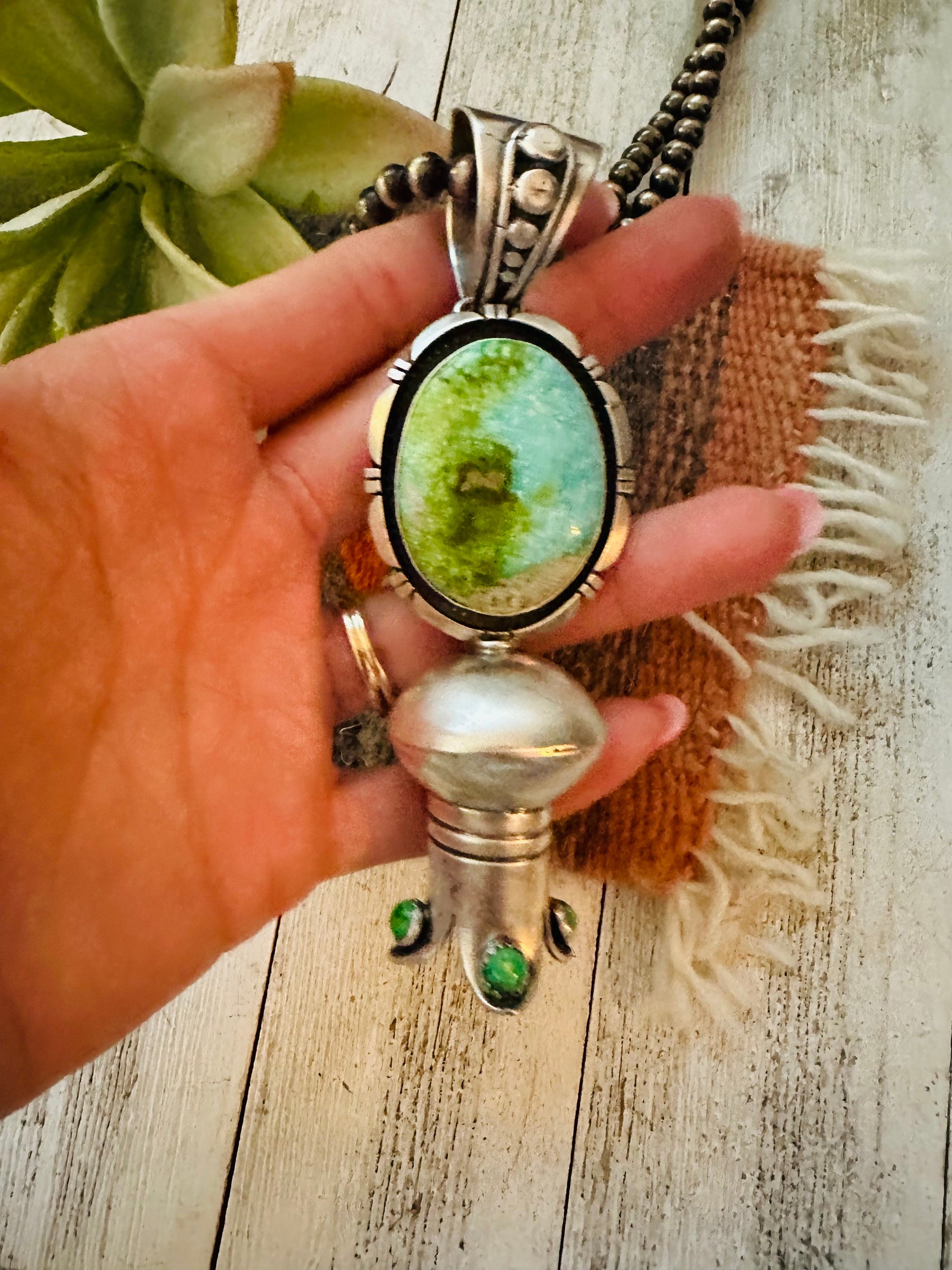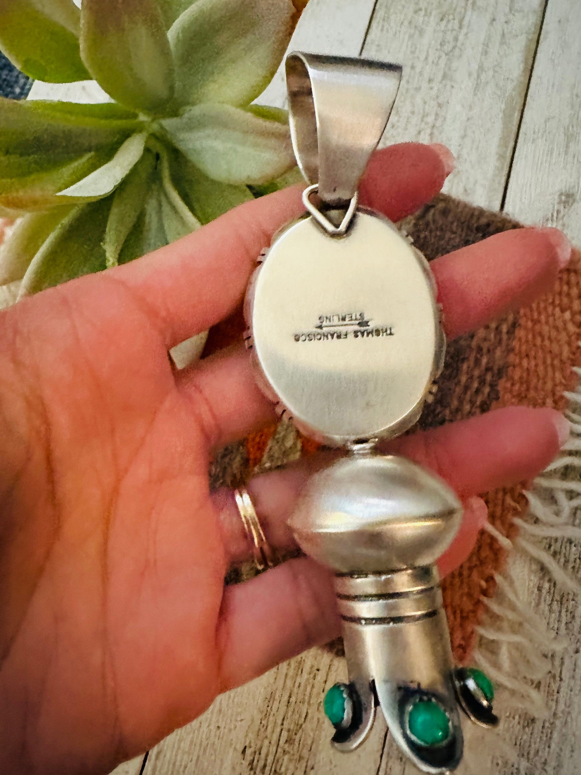 Gorgeous Navajo Turquoise and Sterling Silver Blossom Pendant. Such beautiful craftsmanship! Pendant measures 4 3/8 inches long and 1 3/8 inches wide. Bale measures 5/8 of an inch across. Great pendant for your favorite beads. Signed by the artist Thomas Francisco and stamped sterling.