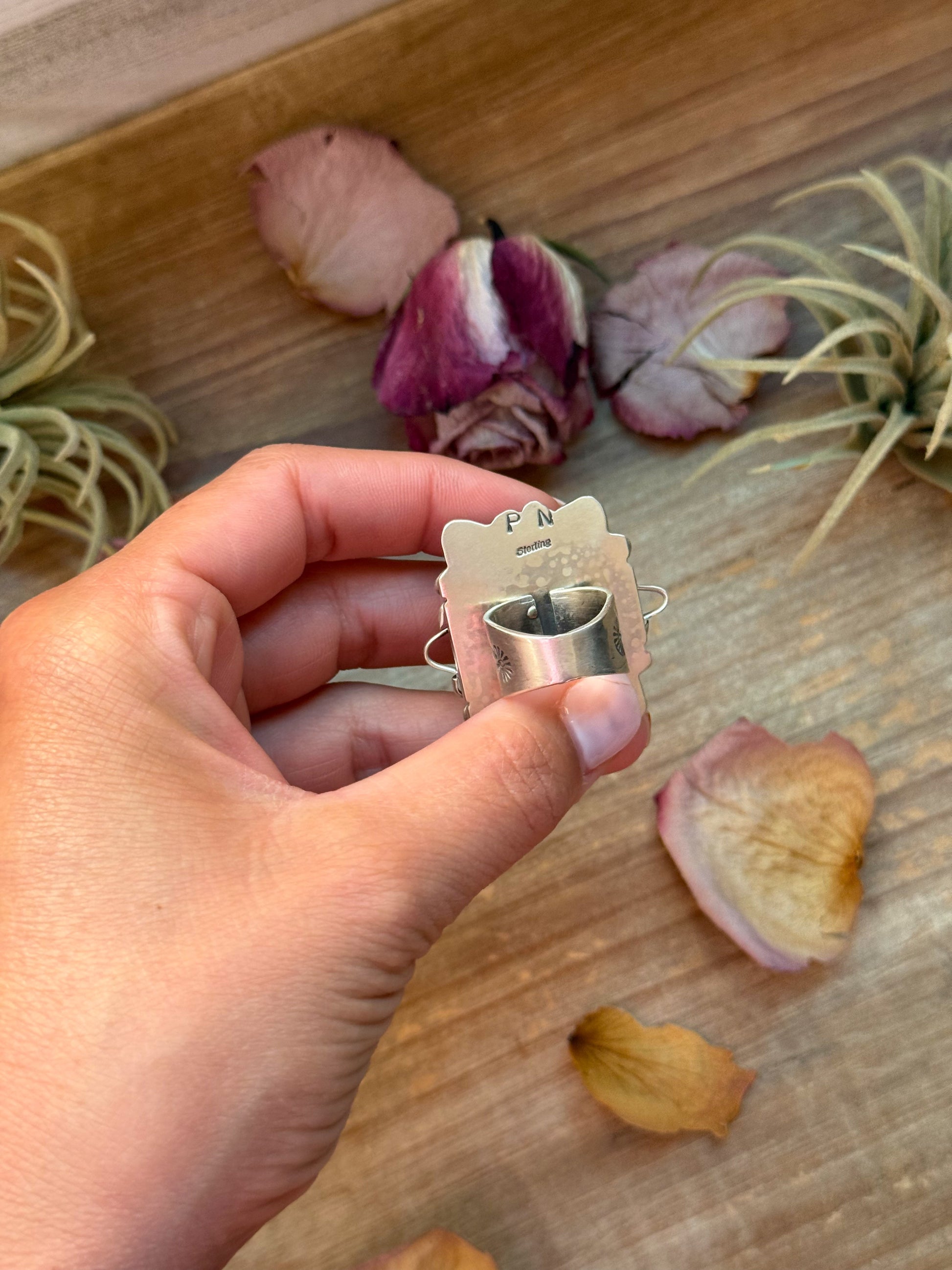 Stamped PN and STERLING, this size 6.5 ring reflects Philbert Nez’s signature craftsmanship, blending traditional Navajo artistry with timeless design. Each stone is one-of-a-kind, with natural variation in its ribbon pattern and color.