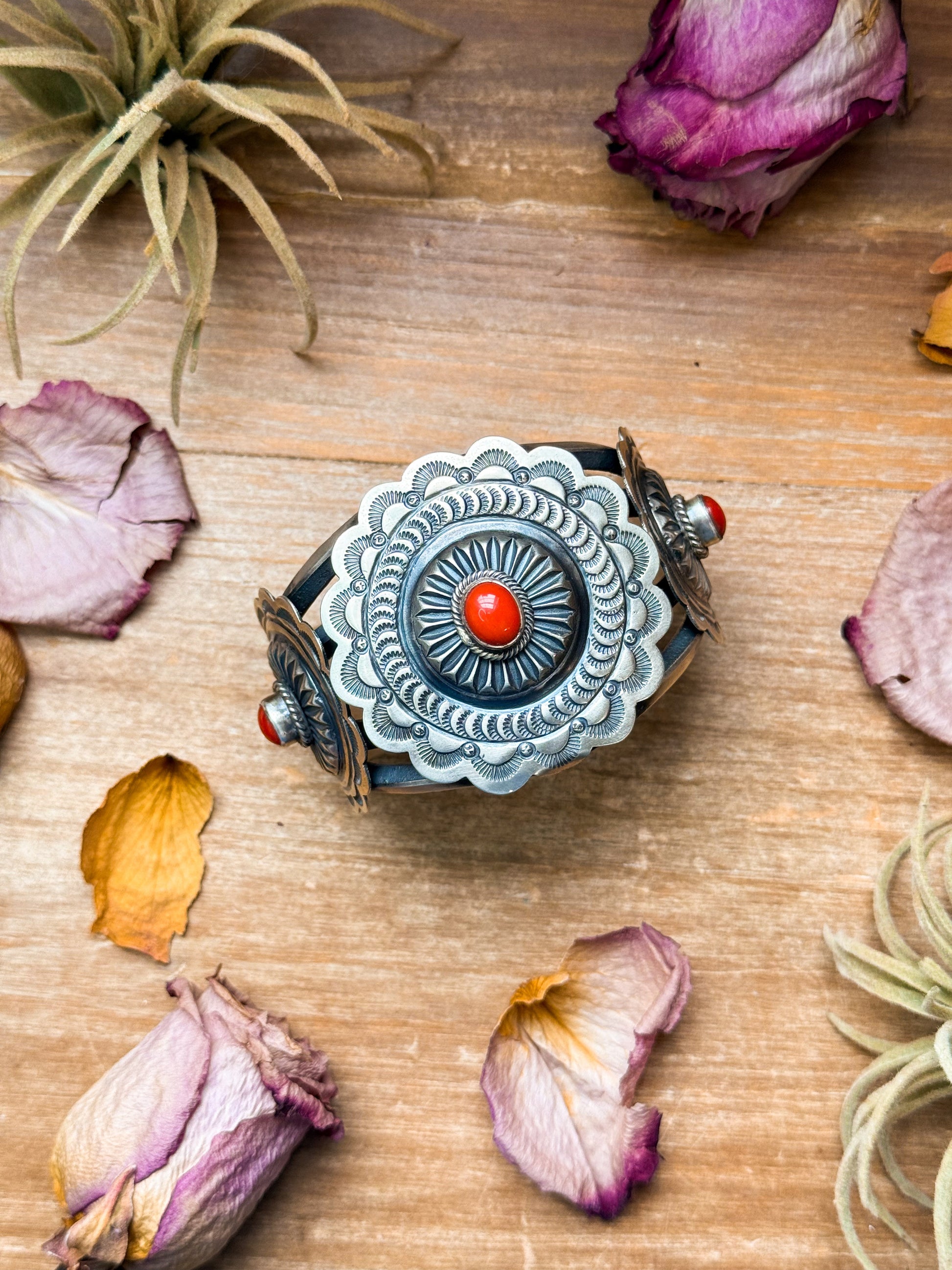 This Native made jewelry set includes a stunning sterling silver cuff, adjustable ring, and matching coral dangle earrings, all handcrafted with care and tradition. The cuff and ring are made by Navajo artist Emerson Brown, featuring genuine coral stones in detailed silver settings. The earrings feature a post-on-top design with dangling coral drops, adding movement and charm. Each piece is stamped “Sterling” and showcases the timeless craftsmanship of Native artistry — a complete, collectible set you’ll treasure forever.