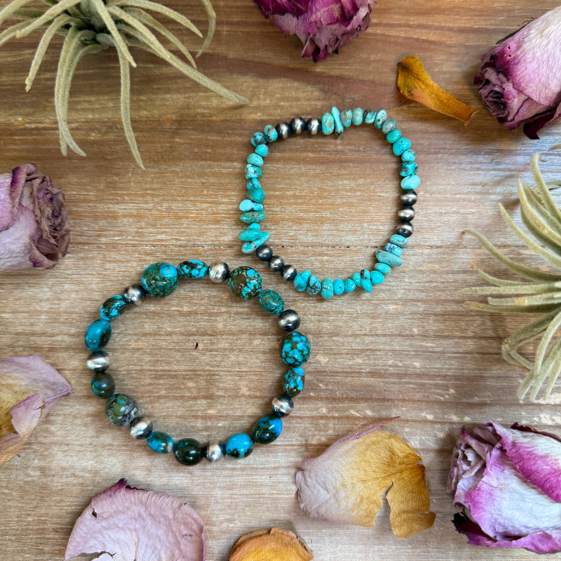 terling Silver 4-6mm Machine Bead Campitos Turquoise Free Form Nugget Stretchy, Will Fit Up To 8” Wrist, Artists Colby + Addalie Ogg