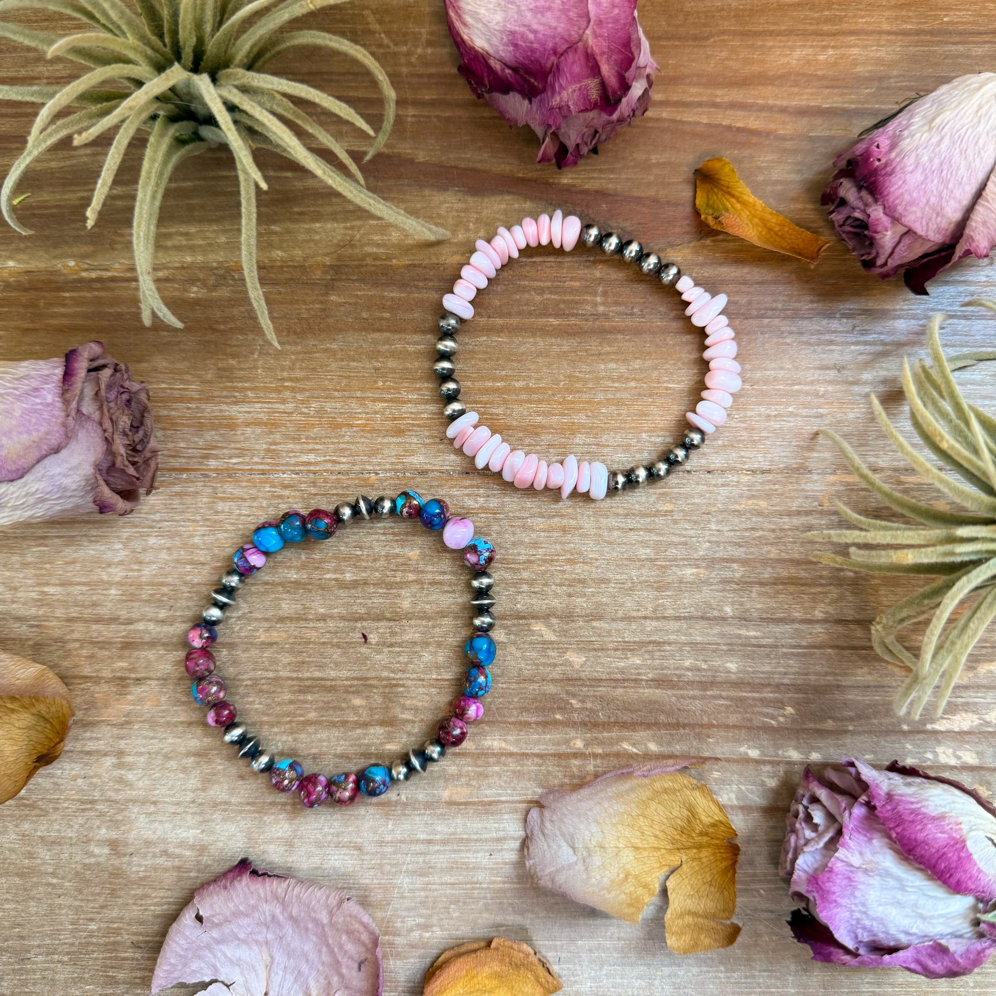 Sterling Silver 5mm Machine Bead Pink Conch Nugget Stretchy, Will Fit Up To 8” Wrist, Artists Colby and Addalie Ogg