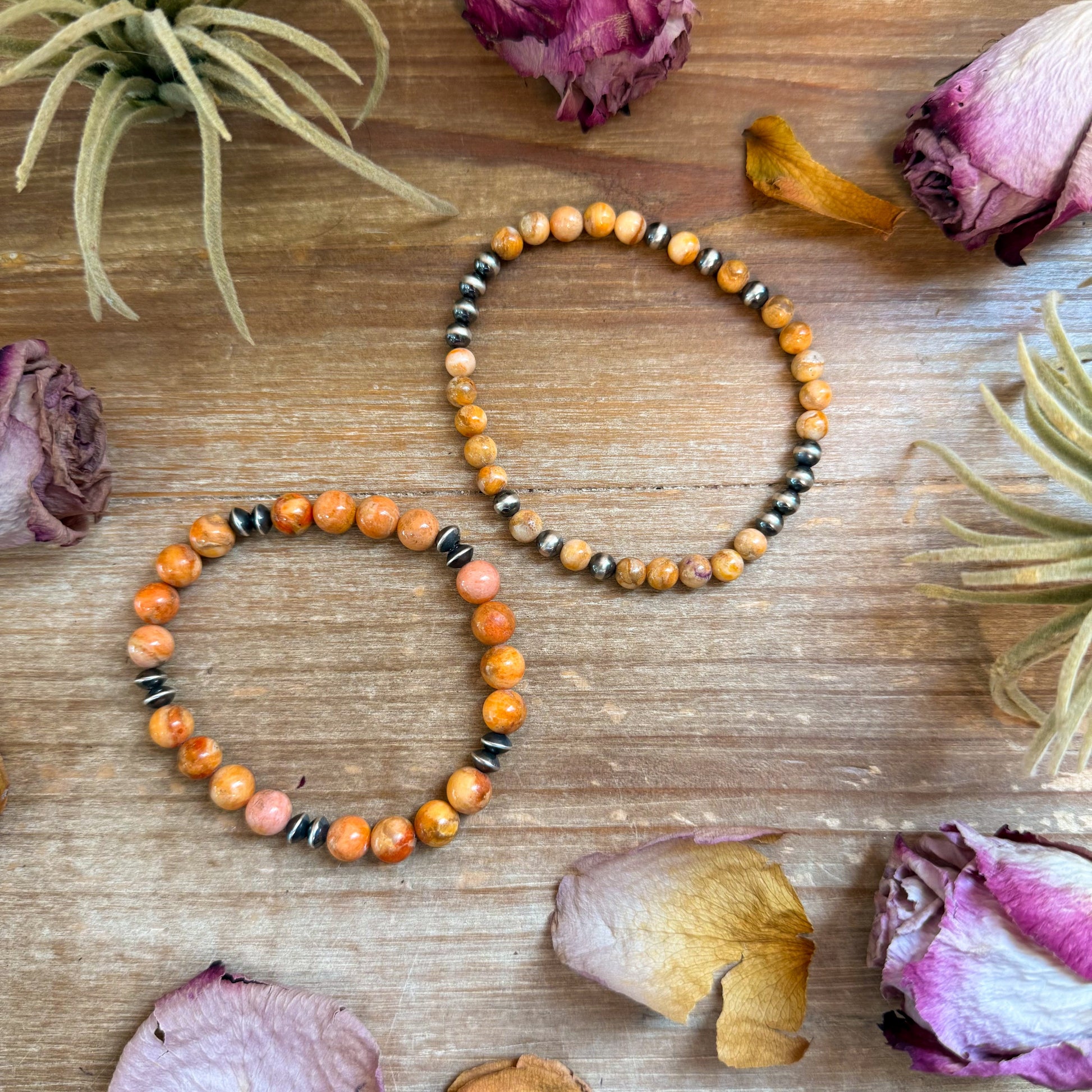 Sterling Silver3-5mm Machine Bead Red Spiny Oyster Stretchy, Will Fit Up To 8.5” Wrist, Artists Colby and Addalie Ogg