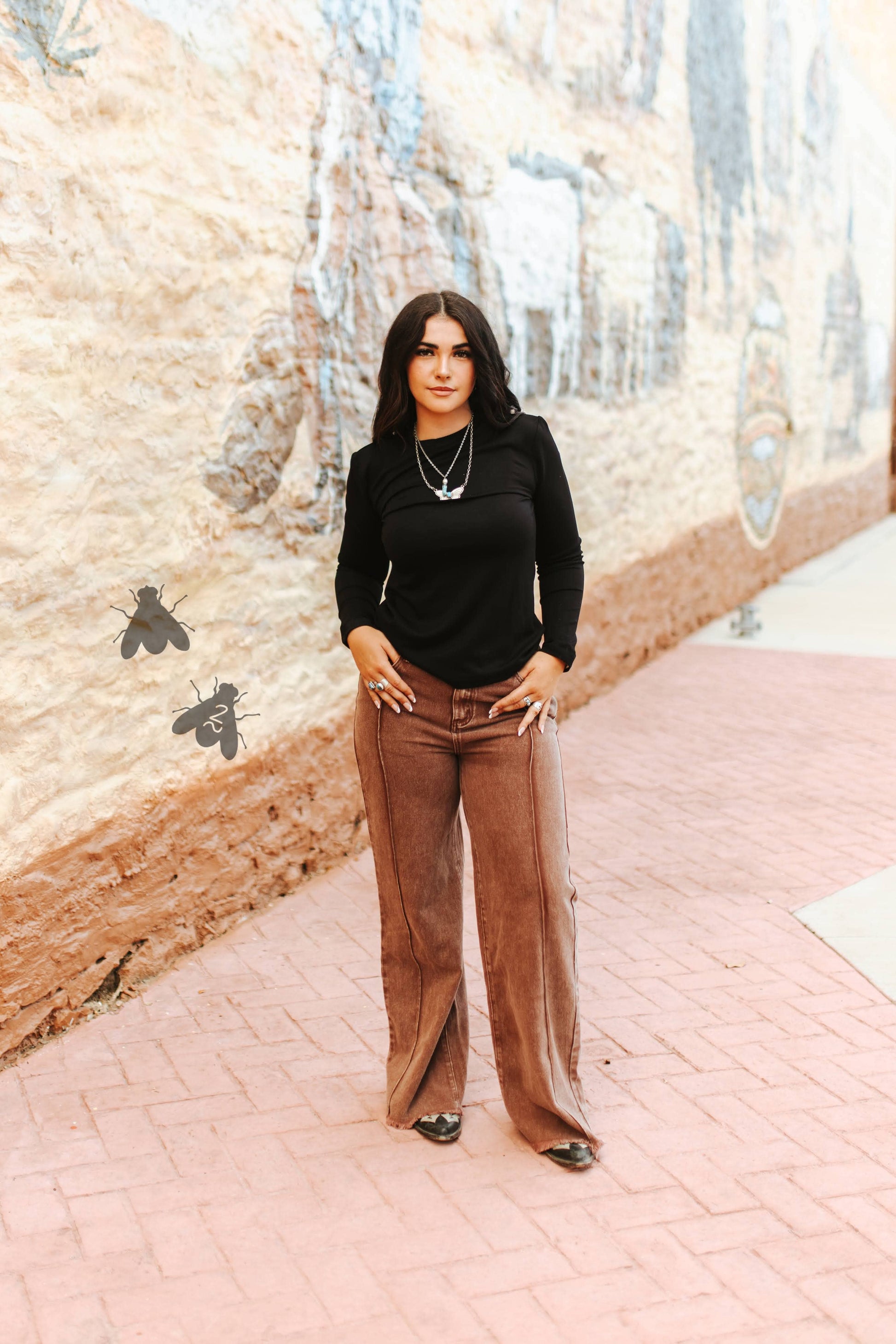 The Whistle Britches in chocolate by 2 Fly Co are more than just jeans. Paired with the Cloud Basic L/S in midnight, they create an outfit that's chic yet comfortable. Designed for inclusivity, these jeans are available from XS to 3X. Hand-drawn and crafted, they are meant to last, not to be tossed away with passing trends. Be a part of the 2 Fly Co family and stay fly!